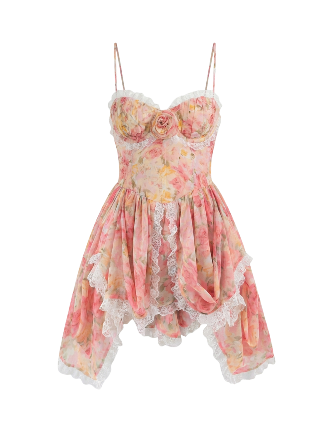 Romantic and full of soft movement, this ultra-feminine mini dress features a dreamy rose print...