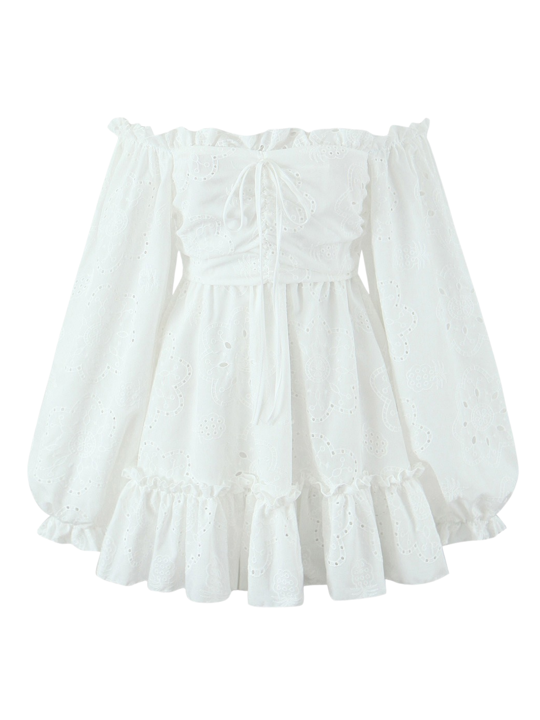 Embrace effortless charm with the Nairobi Off Shoulder Ruffle Mini Dress. This pristine white design...