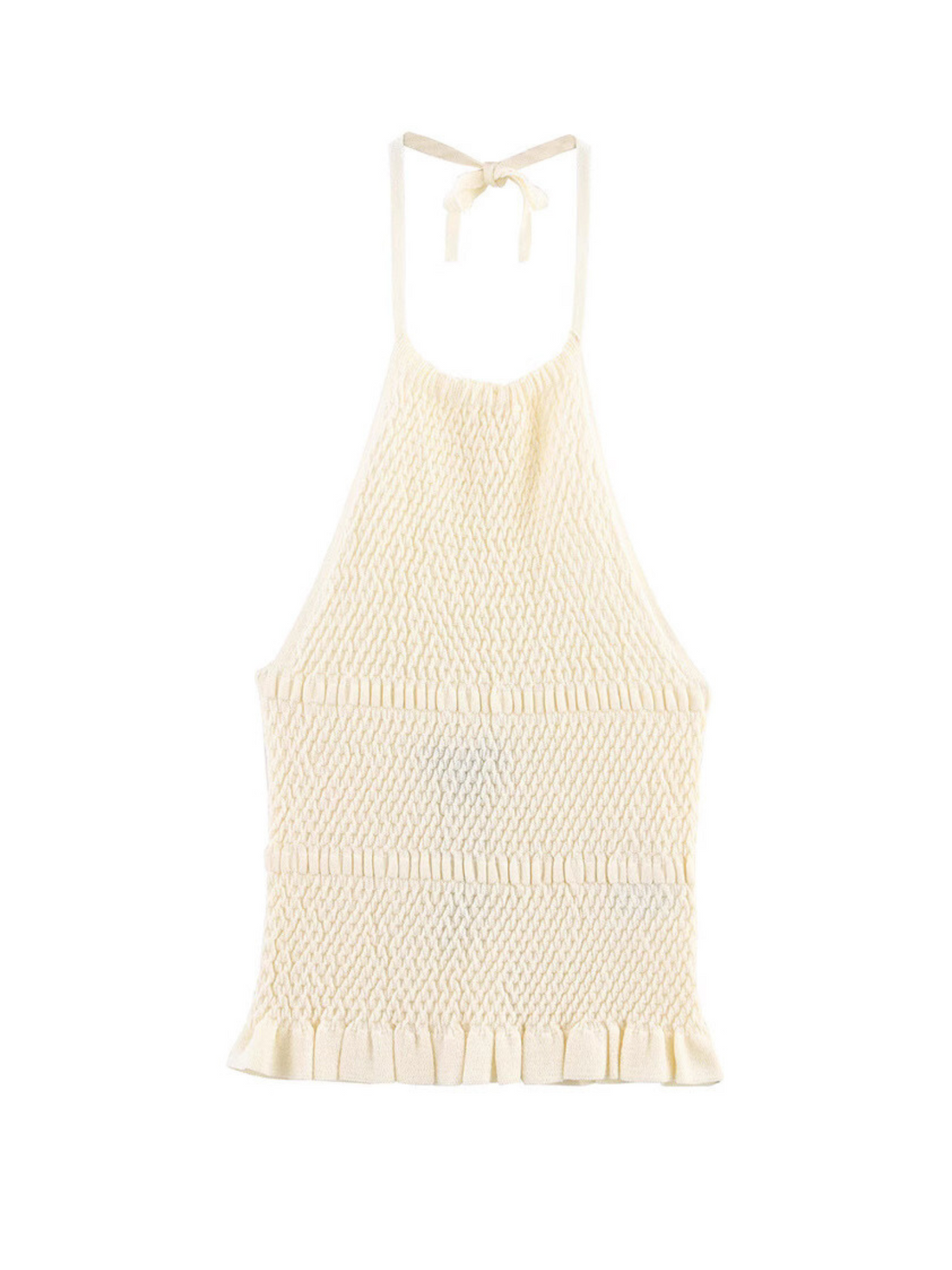 Embrace effortless sophistication with the Aela Knit Halter Top, a chic staple for warm-weather elegance....
