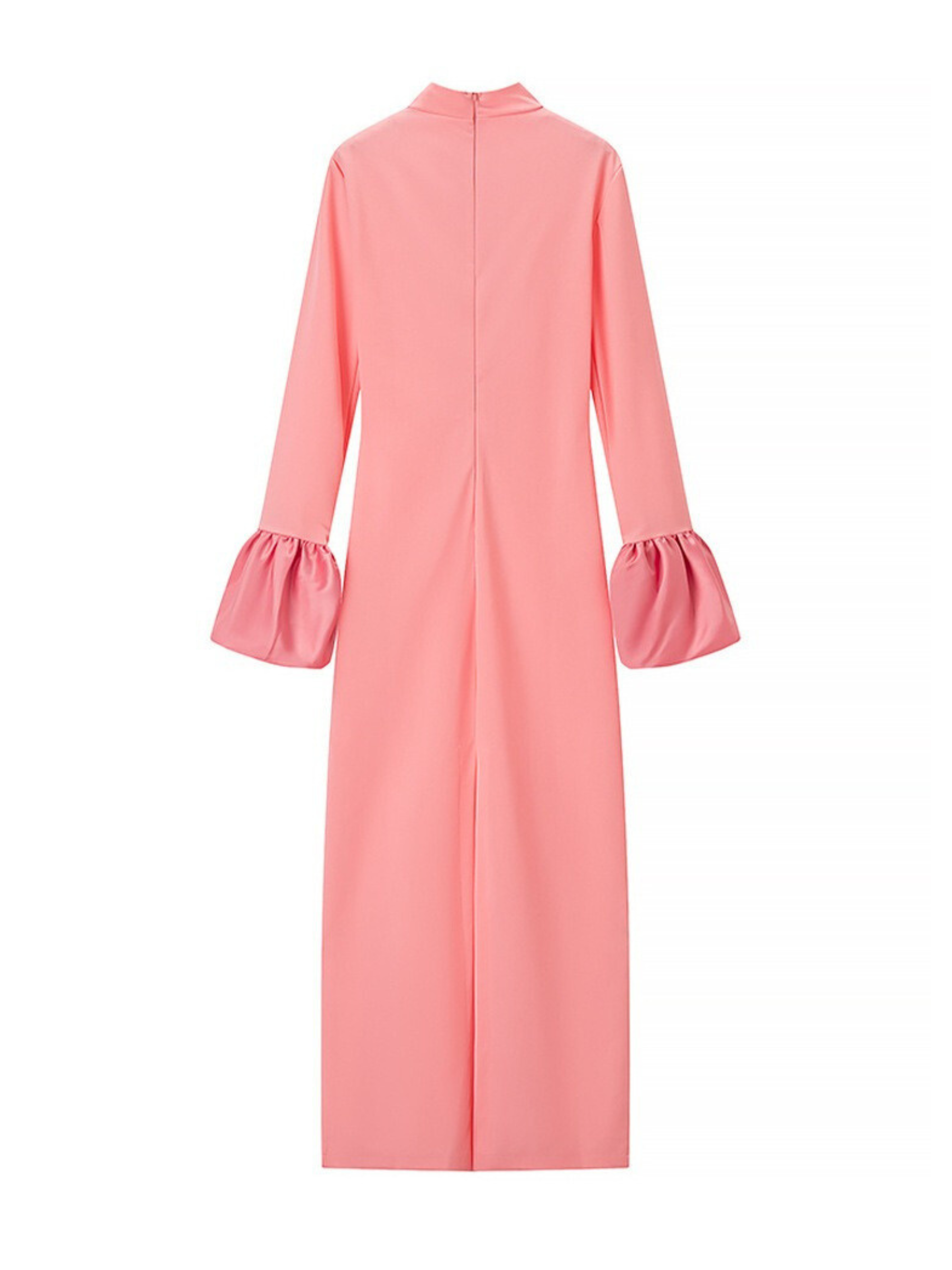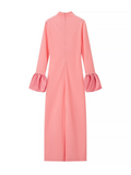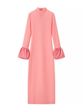 Embrace graceful sophistication with the Ahna Bell Sleeve Maxi Dress, a charming addition to your wardrobe. Crafted in a delicate pink hue, this dress features an elegant mock neck and dramatic bell sleeves that create a fluid, flattering silhouette. Its refined design makes it perfect for moments that call for understated elegance, effortlessly pairing with delicate heels or minimalist flats for a polished ensemble.