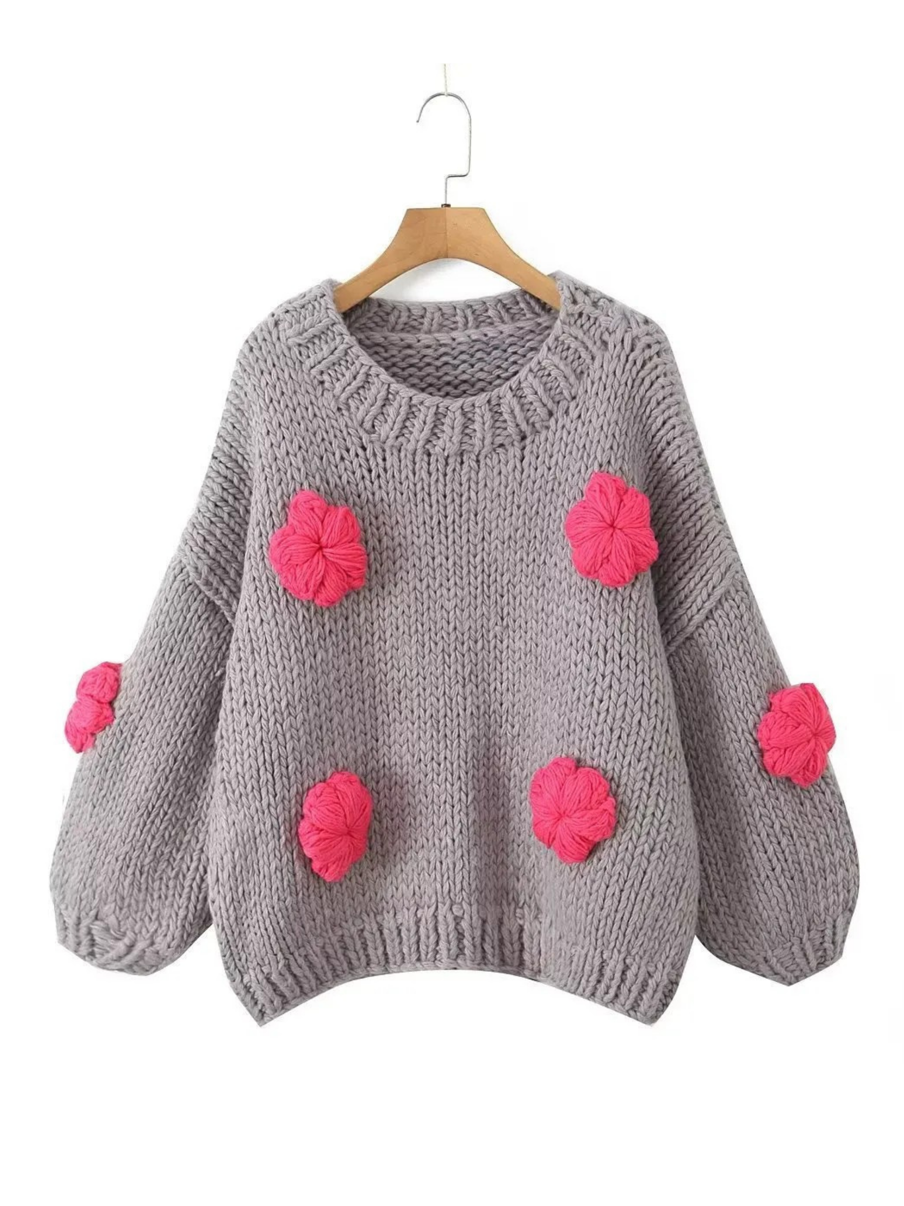 Embrace effortless style with the Ahtziri Chunky Floral Knit Sweater, a standout piece designed for cozy sophistication. This beautifully crafted sweater features a relaxed, loose fit that drapes comfortably, ensuring both warmth and comfort. Adorned with striking three-dimensional floral appliques in a contrasting color, it adds a unique artistic touch to your autumn and winter wardrobe. Available in versatile earthy yellow and classic gray, it's perfect for adding a playful elegance to any look.