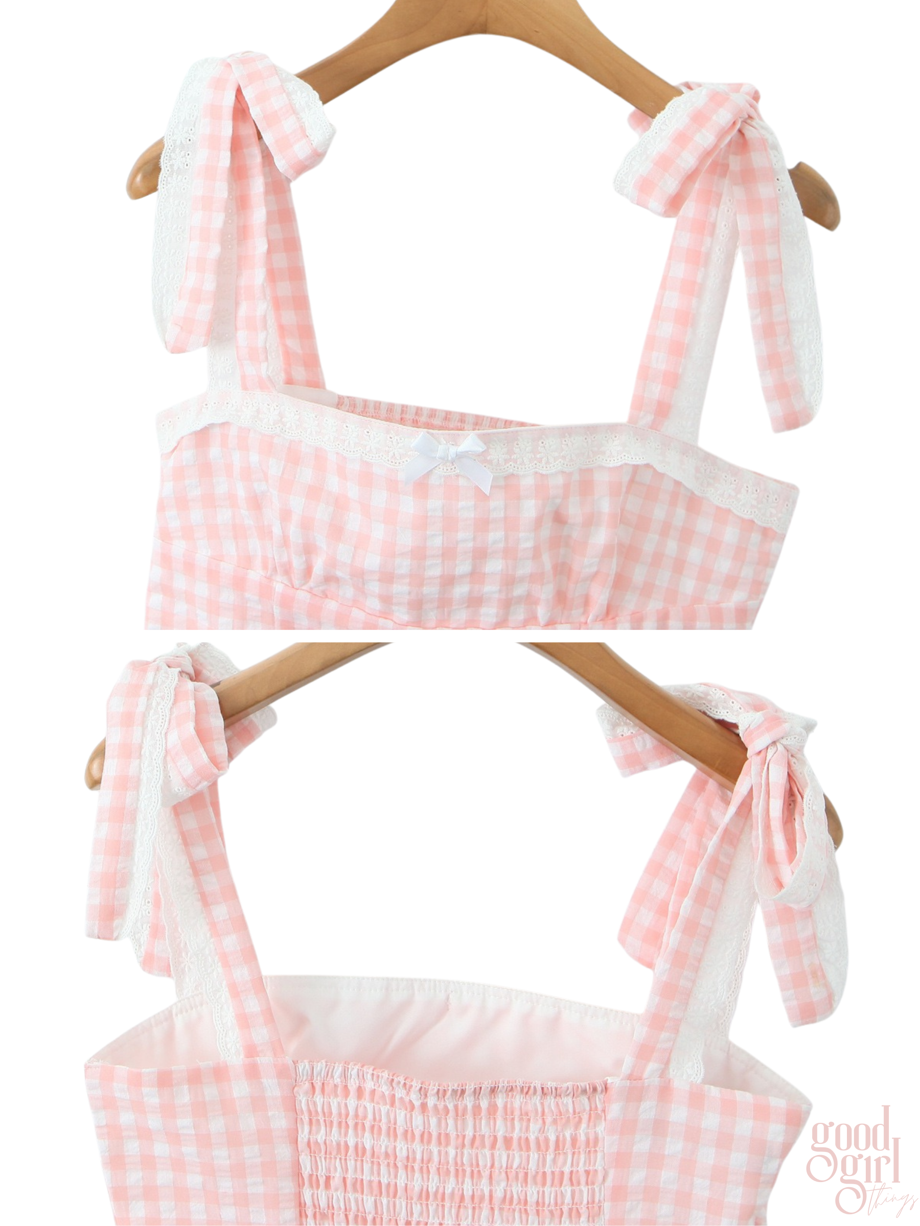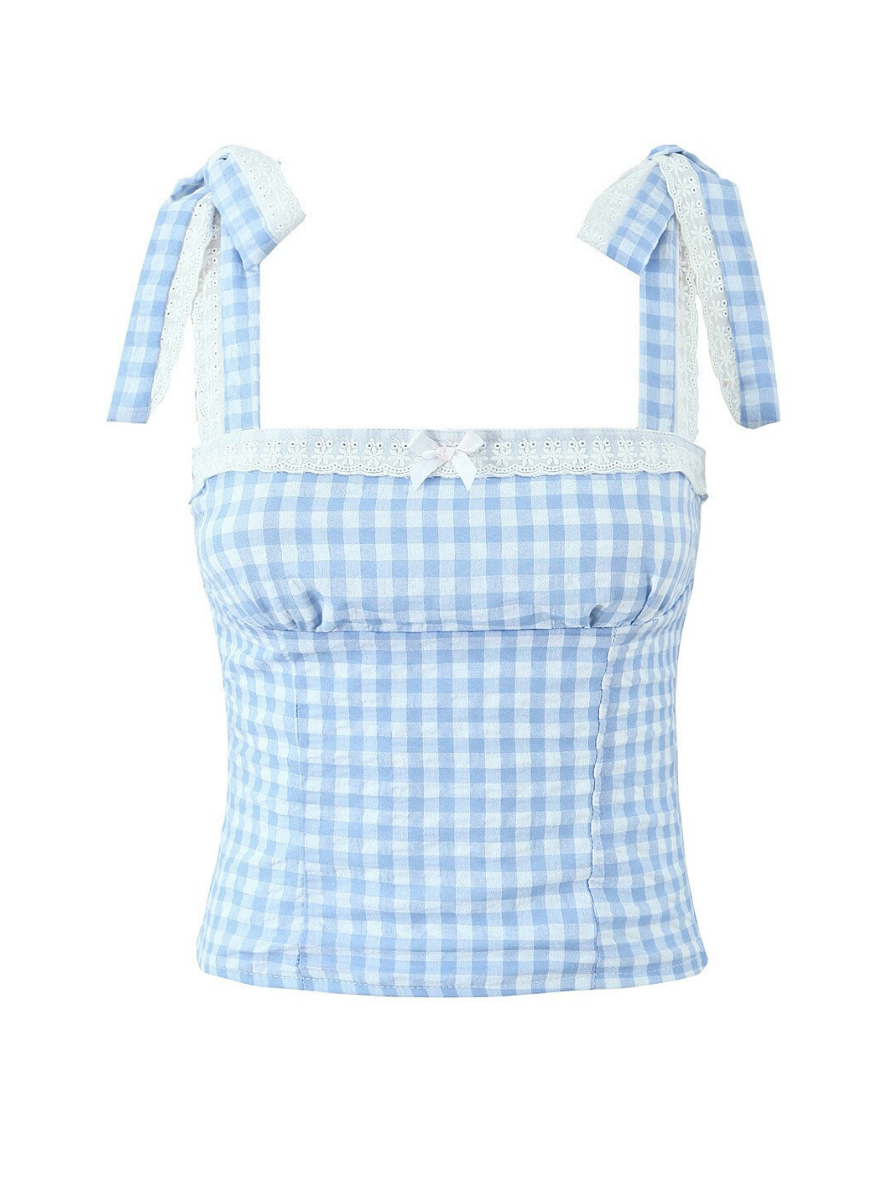 The Amarah Plaid Lace Camisole offers a blend of playful charm and delicate allure, perfect for a chic, youthful look. This sweet top features a classic plaid pattern adorned with intricate lace trim, creating a harmonious balance of texture and style. Available in soft blue and delicate pink hues, it's designed to captivate. Pairs effortlessly with high-waisted denim for a casual daytime ensemble or a sleek mini skirt for an evening out.