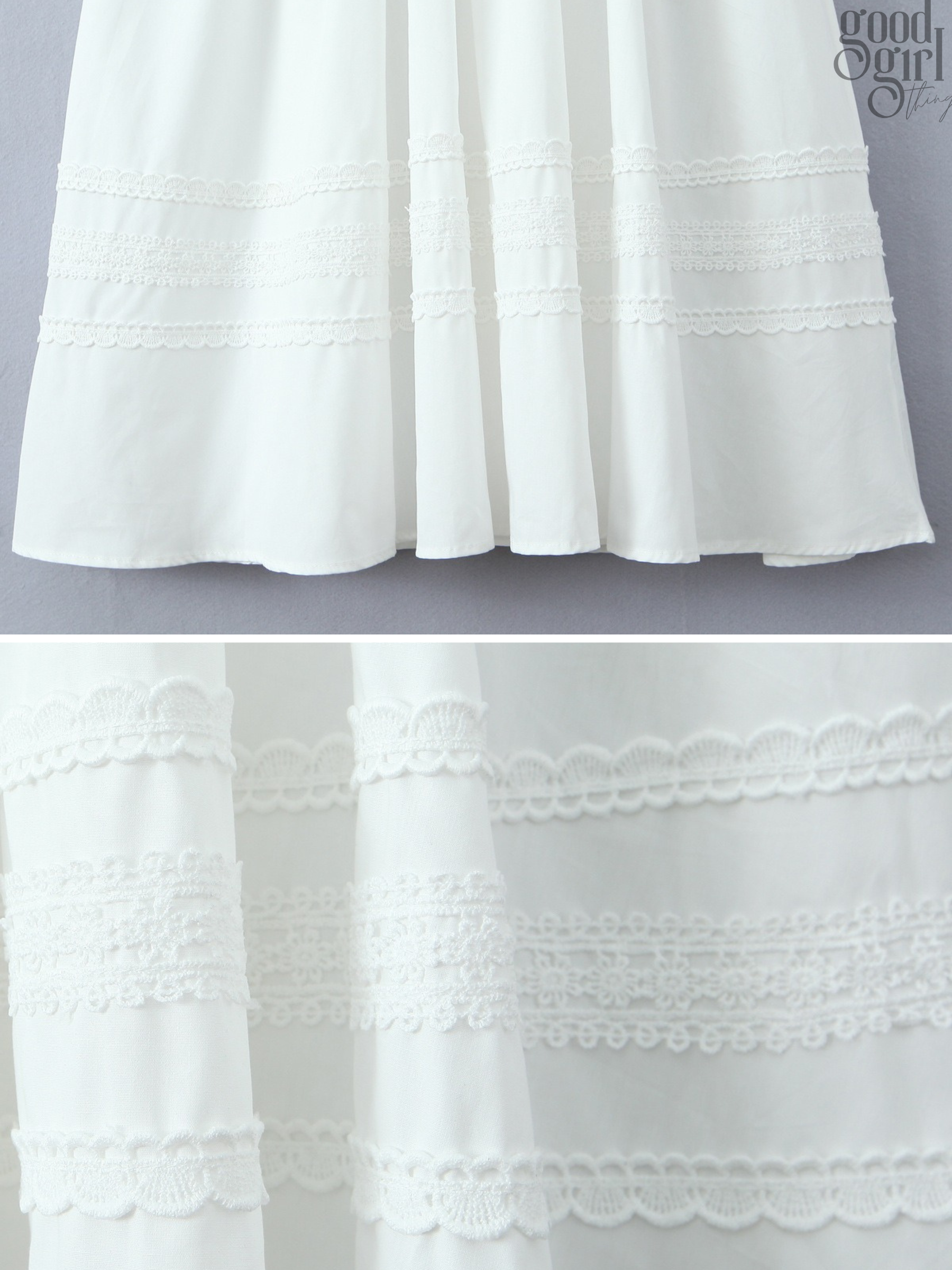 - Delicate lace embellishments on skirt tiers