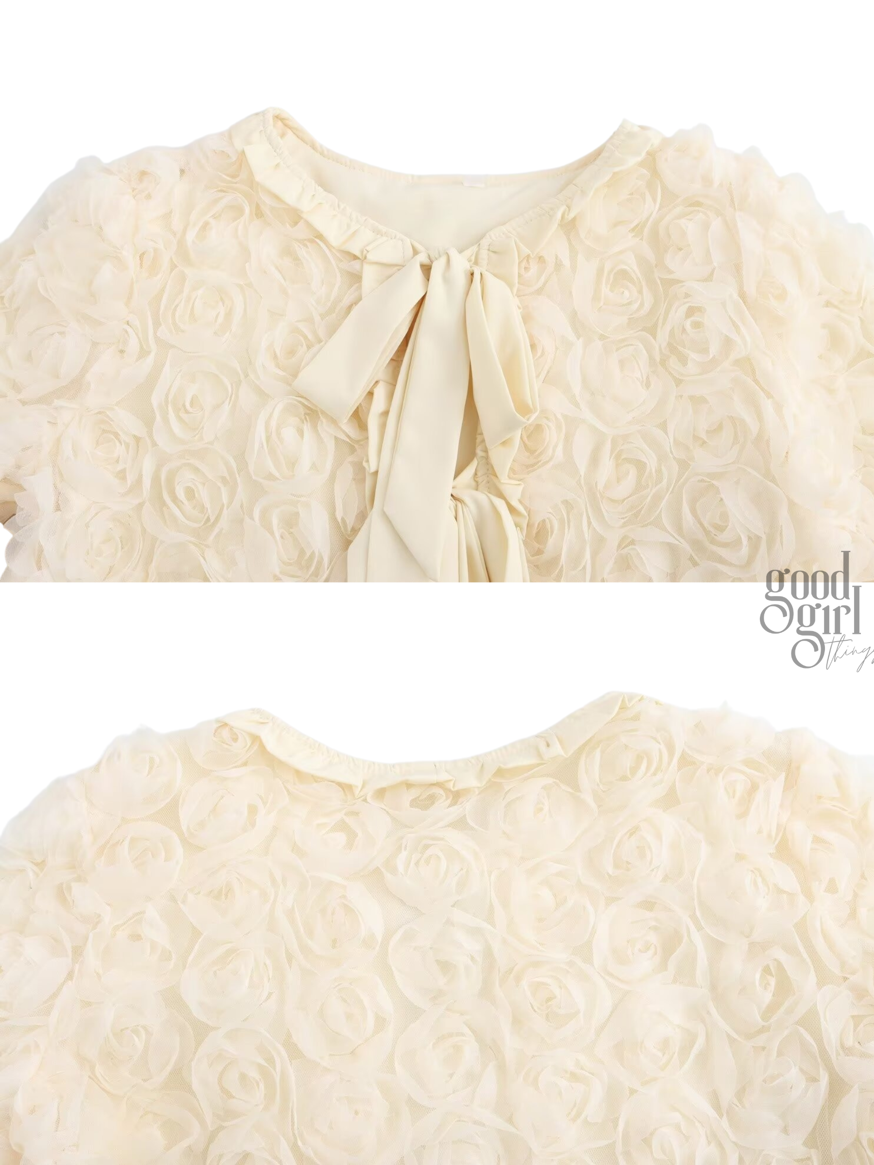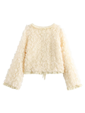 Embrace effortless elegance with the Bethlehem Floral Ruffle Jacket. This exquisite beige jacket features delicate three-dimensional floral embellishments that add a touch of romantic charm to any ensemble. Designed with a classic round neckline and long sleeves, it offers a sophisticated yet playful silhouette. The charming ruffle trim along the front and the dainty tie closure complete its captivating appeal. Pairs perfectly with tailored trousers for a polished look or distressed denim for a chic casual vibe.