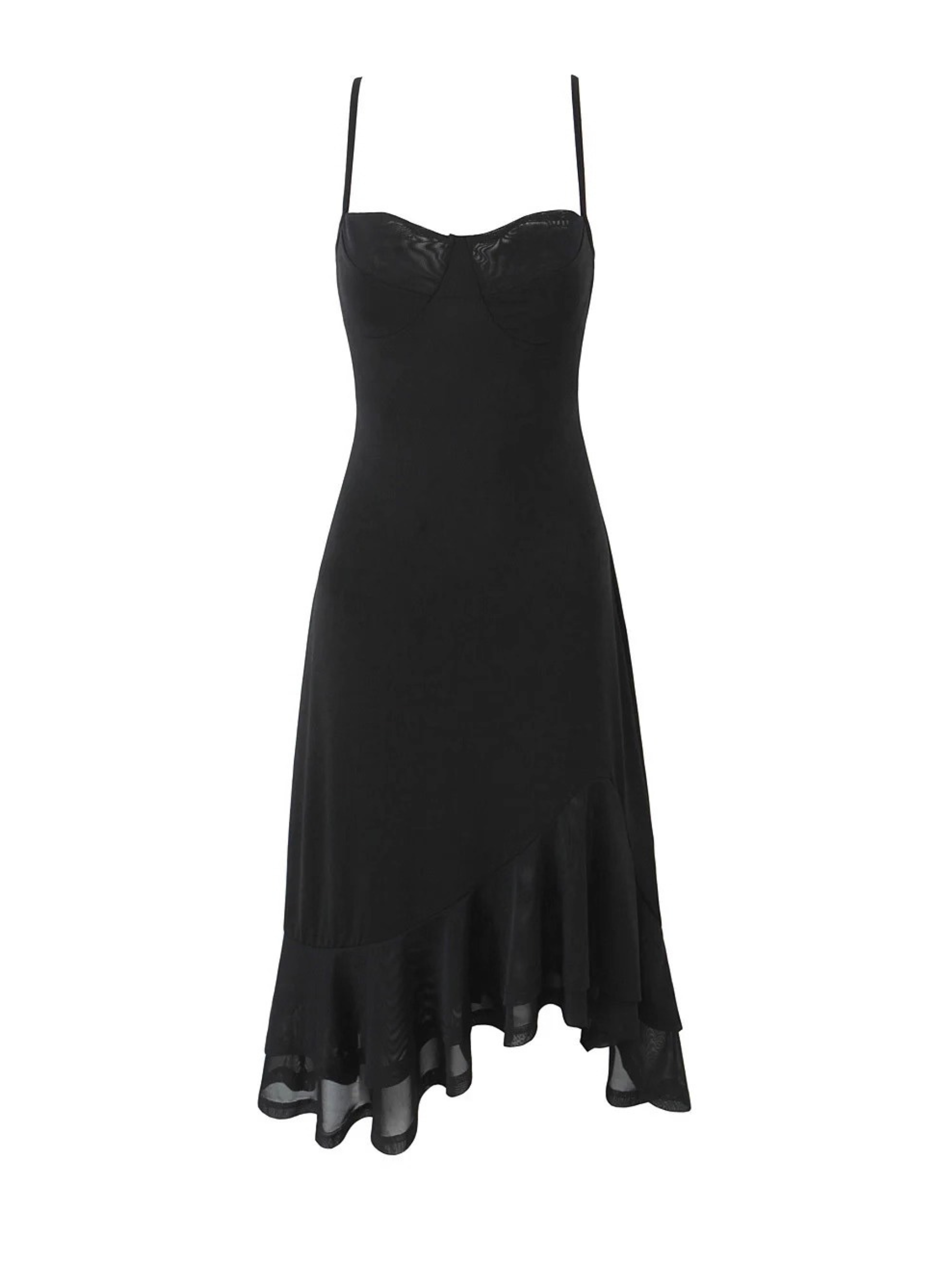 Embrace effortless elegance with the Charlotte Strappy Mesh Midi Dress. This captivating black midi features delicate spaghetti straps and a flattering A-line silhouette, designed to cinch at the waist for a refined look. Its distinctive irregular hem adds a modern, playful touch, making it a standout piece for any sophisticated occasion. Pairs perfectly with minimalist heels and a delicate clutch for a polished evening ensemble.