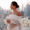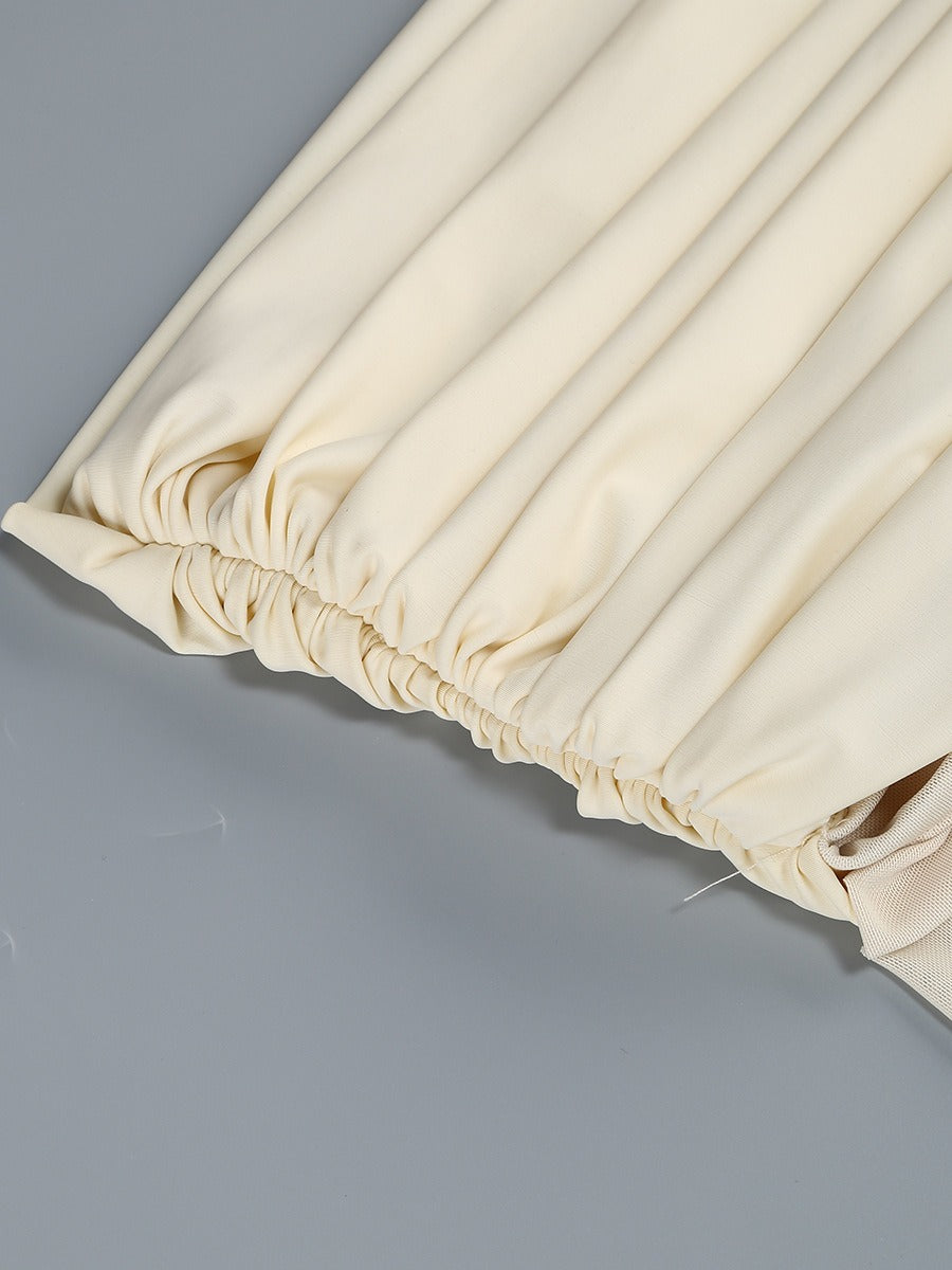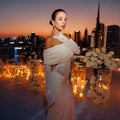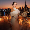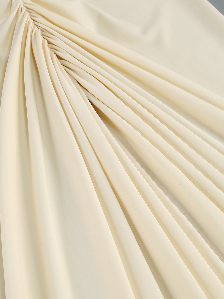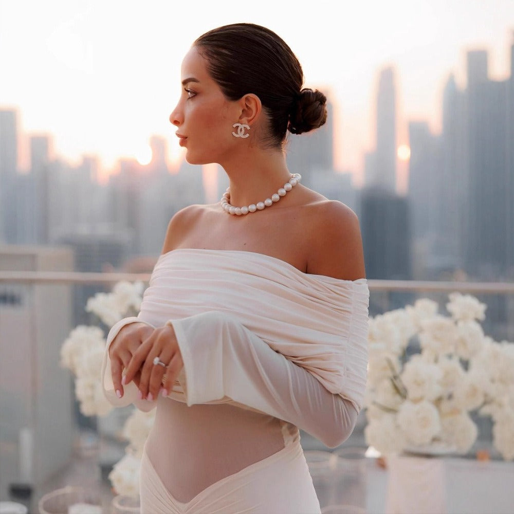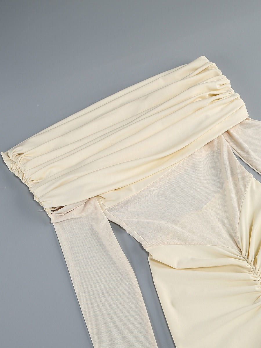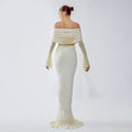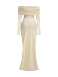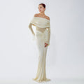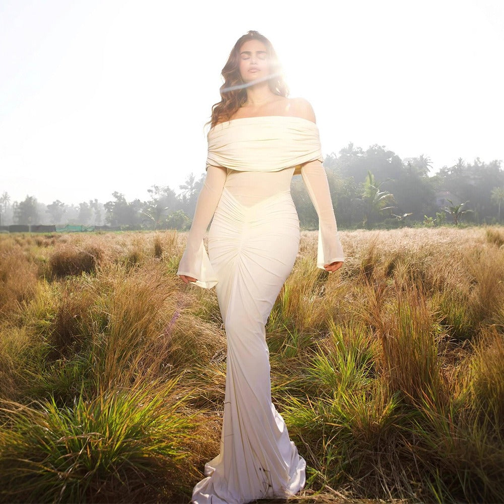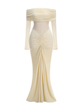 Elegant with a modern, sculpted feel, this off-shoulder maxi dress is designed to contour the body while keeping the look soft and romantic. The draped, ruched neckline creates a statement off-shoulder silhouette, paired with sheer mesh long sleeves for an airy, elevated finish. A cinched center ruching detail draws the eye and flatters the waist and hips, while the floor-length skirt flows into a clean, elongated line—perfect for formal events, dinners, and special occasions.