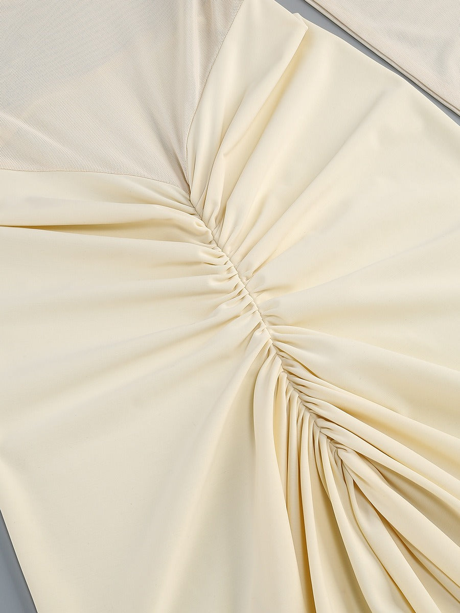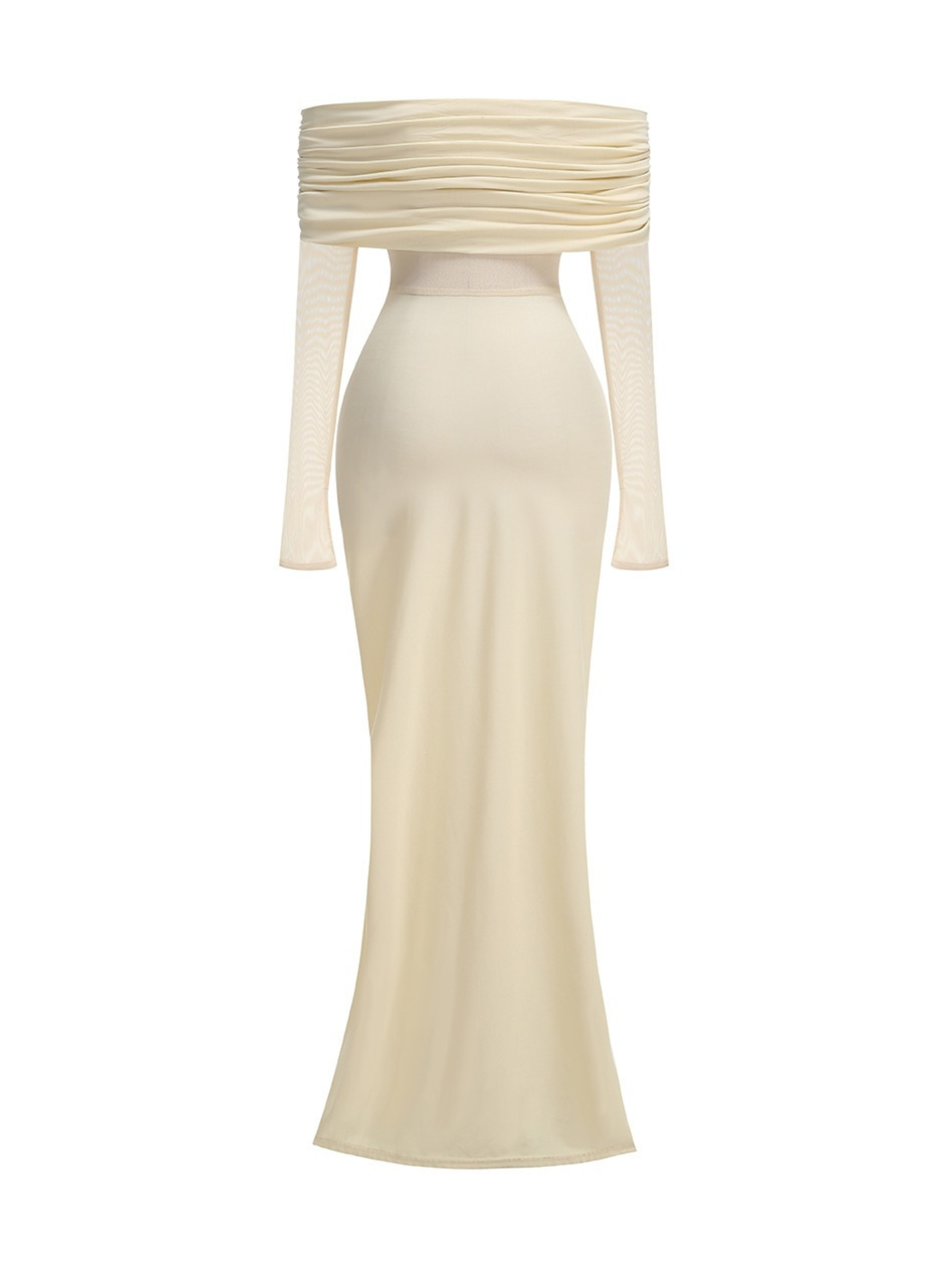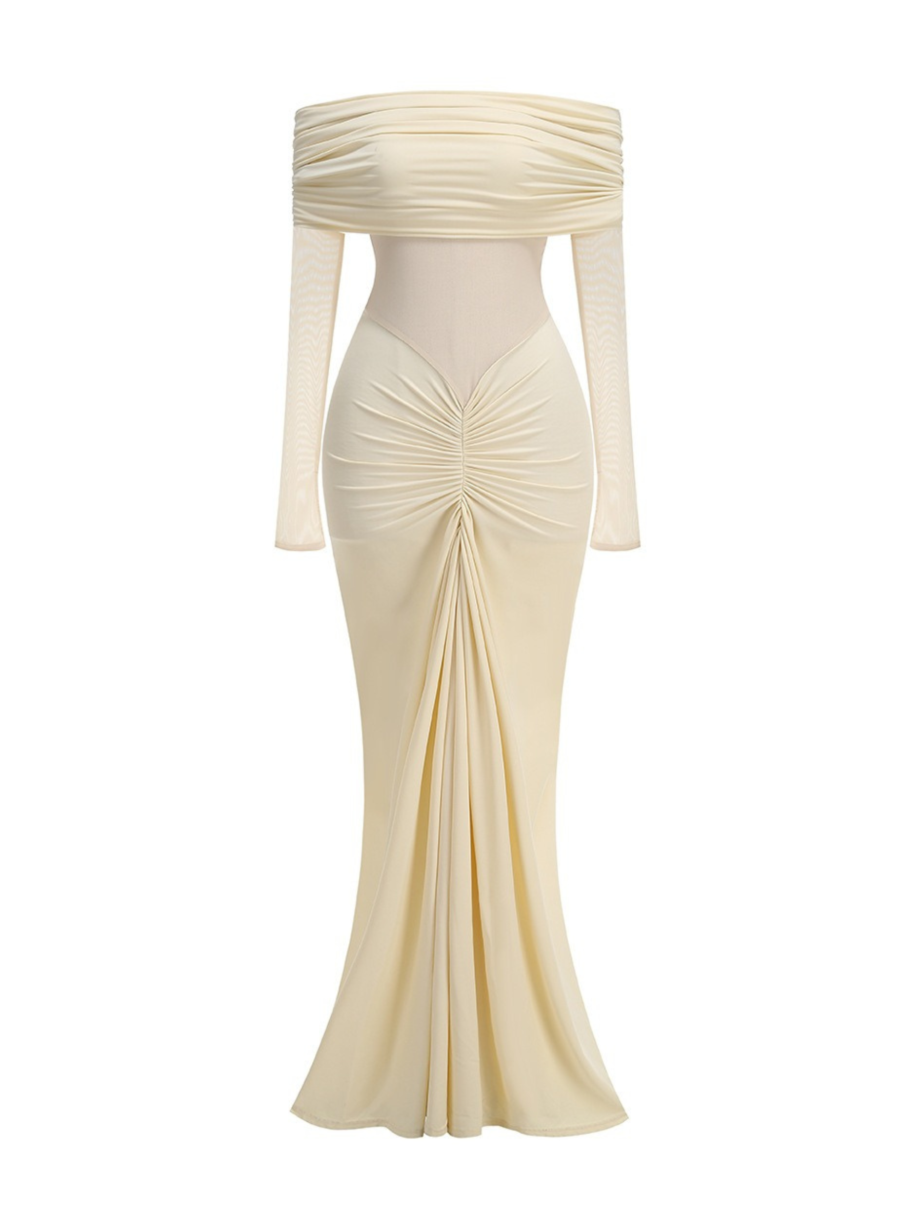 Details: Off-shoulder ruched neckline, sheer mesh long sleeves, center gathered ruching, body-hugging maxi silhouette