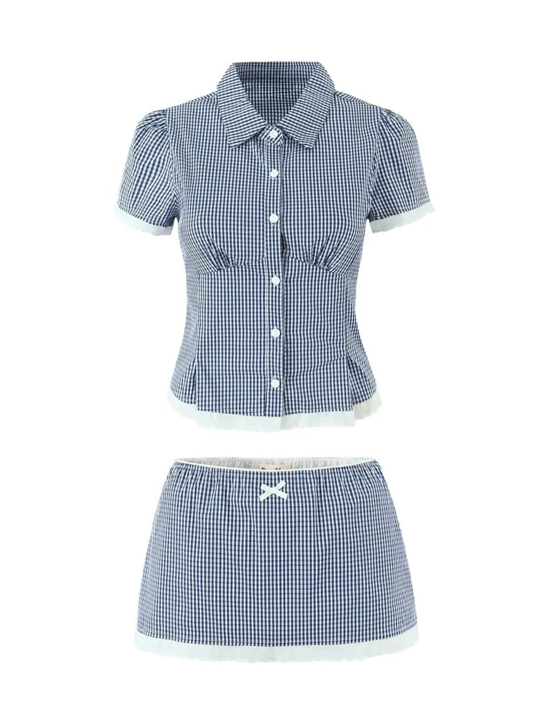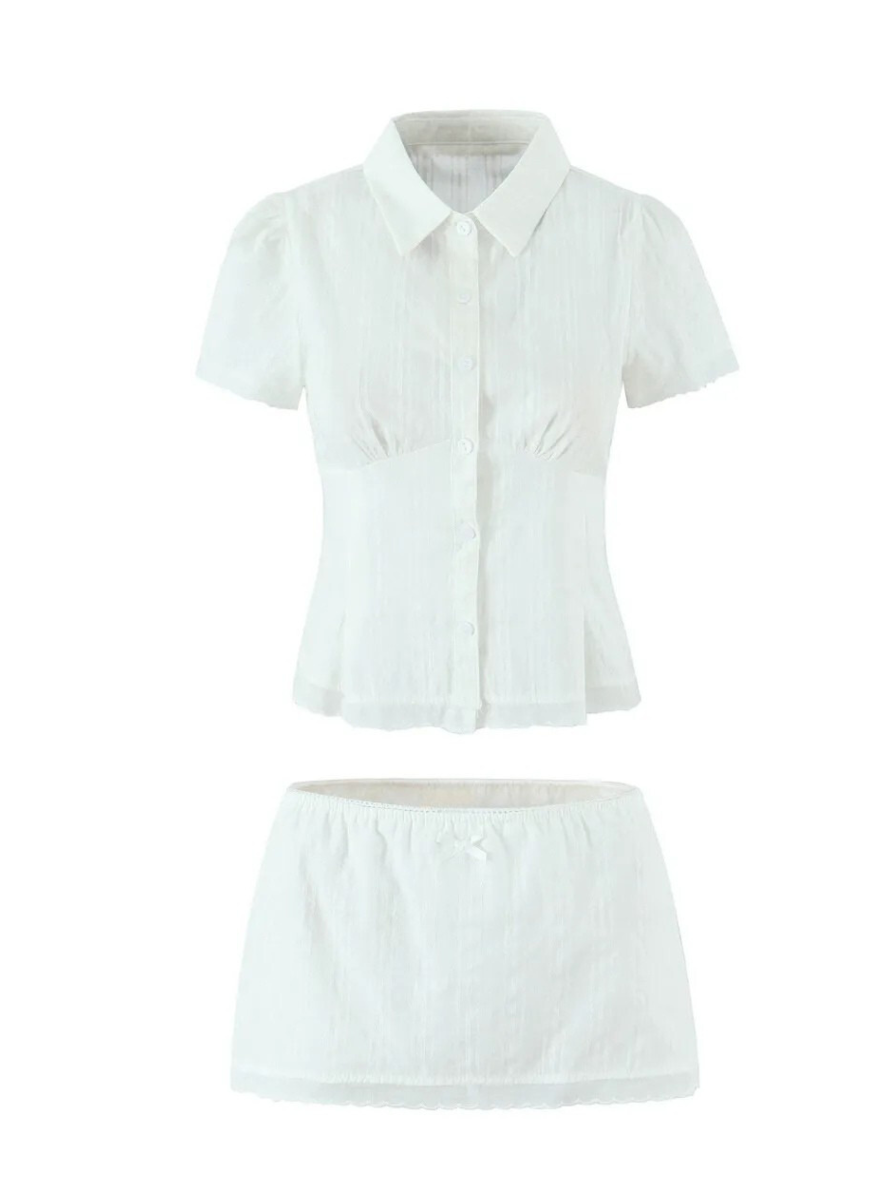 Embrace fresh elegance with the Eleanor Lace Trim Skirt Set, a charming ensemble designed for sun-drenched days. This delightful two-piece features a short-sleeve button-up top and a matching mini skirt, both adorned with delicate lace trim. Perfect for creating a sweet yet stylish silhouette, it captures a carefree spirit. Pairs beautifully with strappy sandals or white sneakers for a relaxed, chic look.