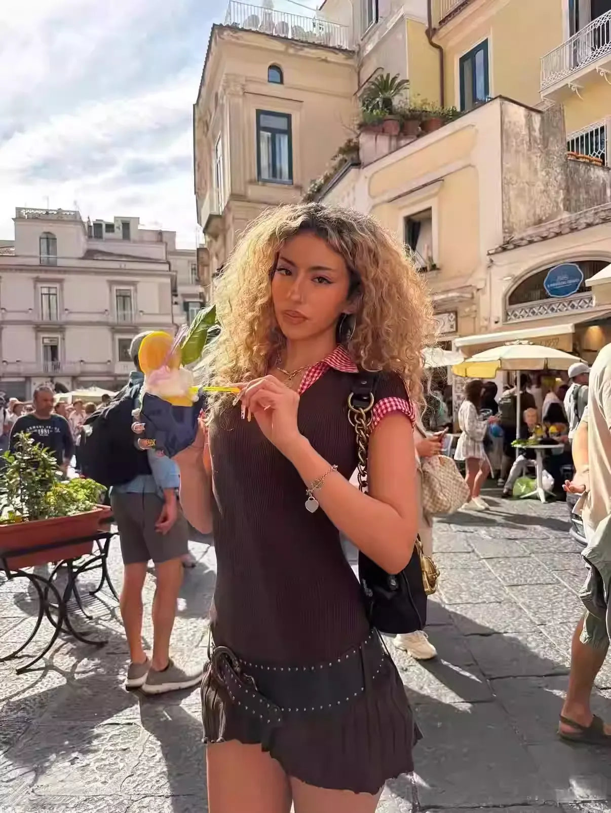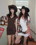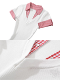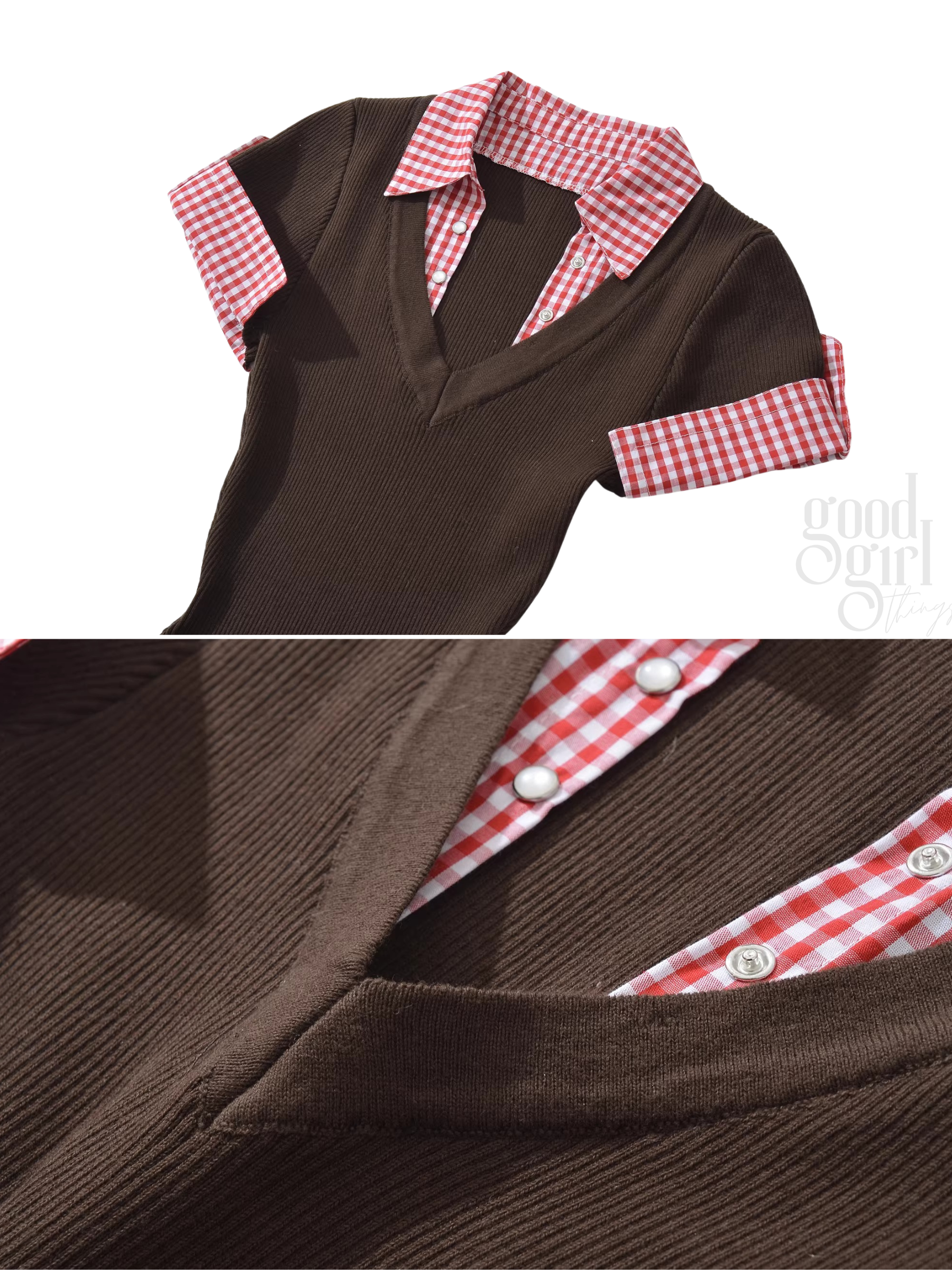 Preppy meets playful in this charming fitted knit mini dress. It features a ribbed V-neck silhouette with a faux layered look — gingham plaid details at the collar and cuffs give the illusion of a shirt underneath. The bottom hem is pleated for added movement and flair. Available in rich chocolate brown or clean white, it’s the perfect pick for a school-girl inspired outfit or a retro diner date.