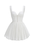 Discover timeless allure with the Emme Lace Mini Dress, designed for unforgettable moments. This radiant white dress features a chic low-cut neckline and delicate spaghetti straps that frame the décolletage beautifully. Striking side cut-outs and a playful A-line silhouette create a captivating and flattering look, perfect for any special occasion. The back is adorned with an intricate criss-cross lace-up detail, adding an unexpected touch of elegance. Pairs effortlessly with strappy heels and delicate jewelry for a sophisticated evening out.