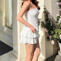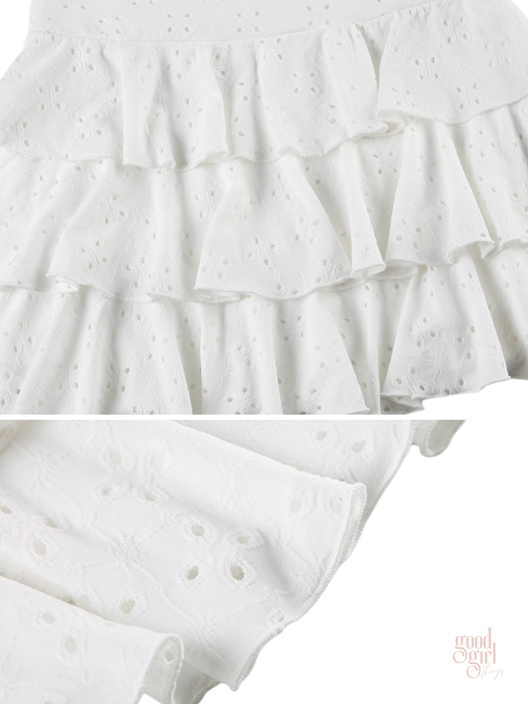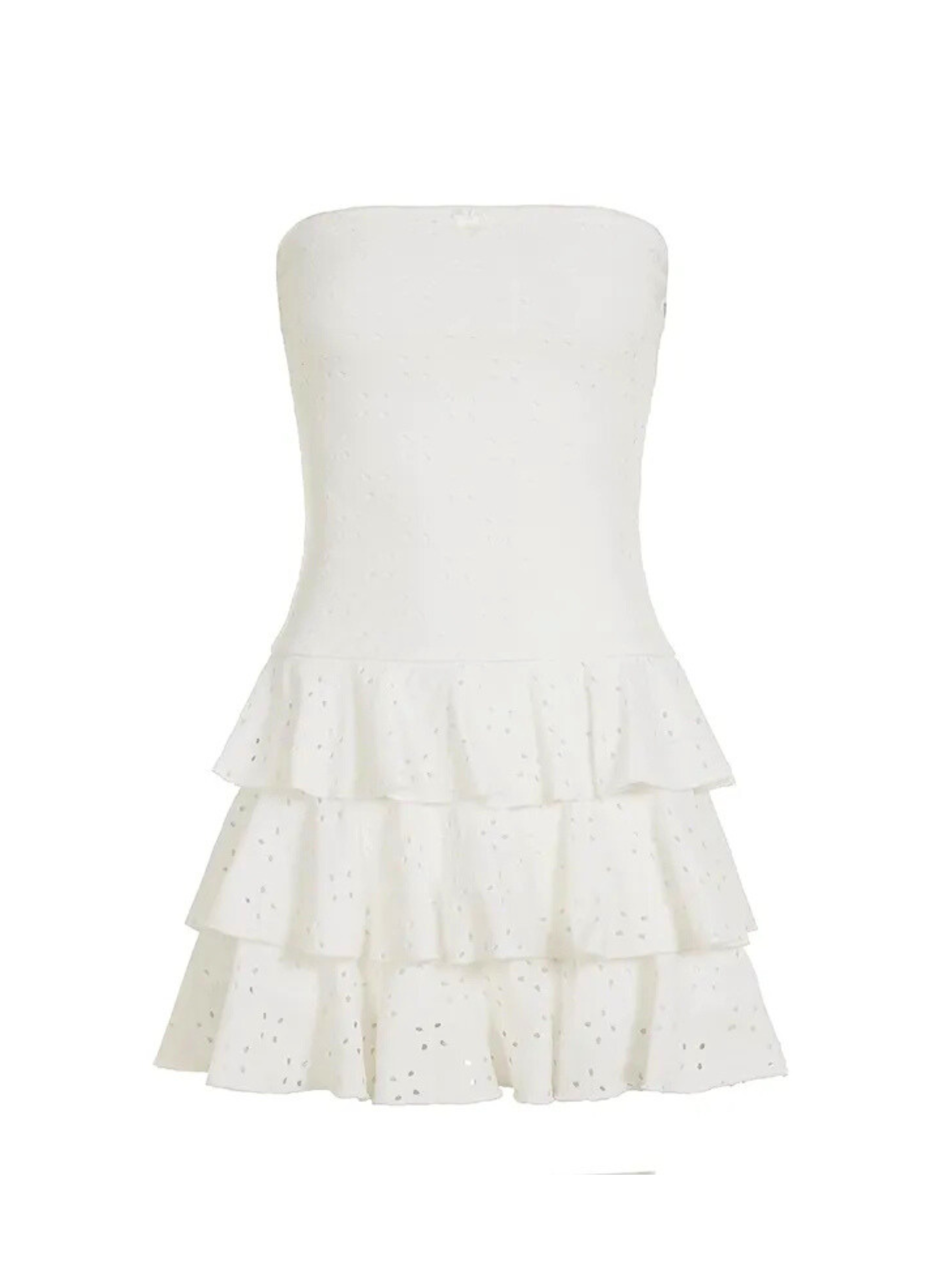 Effortlessly flirty and charming, this strapless romper gives the illusion of a ruffled mini dress while offering the comfort and ease of hidden shorts. Crafted from delicate eyelet lace with tiered layers and a soft inner lining, it’s the perfect blend of romantic and practical. Ideal for warm days, garden parties, or a playful summer look.