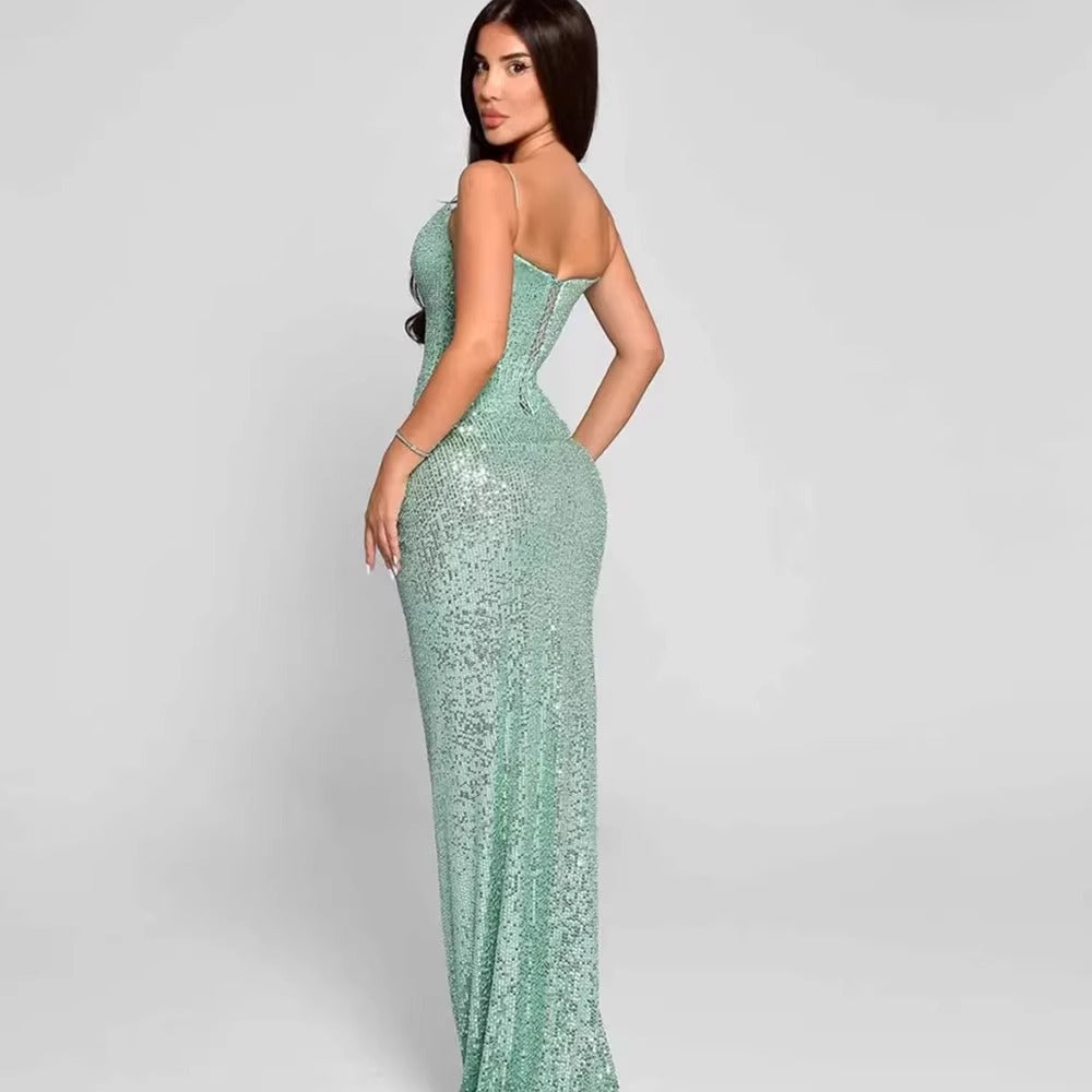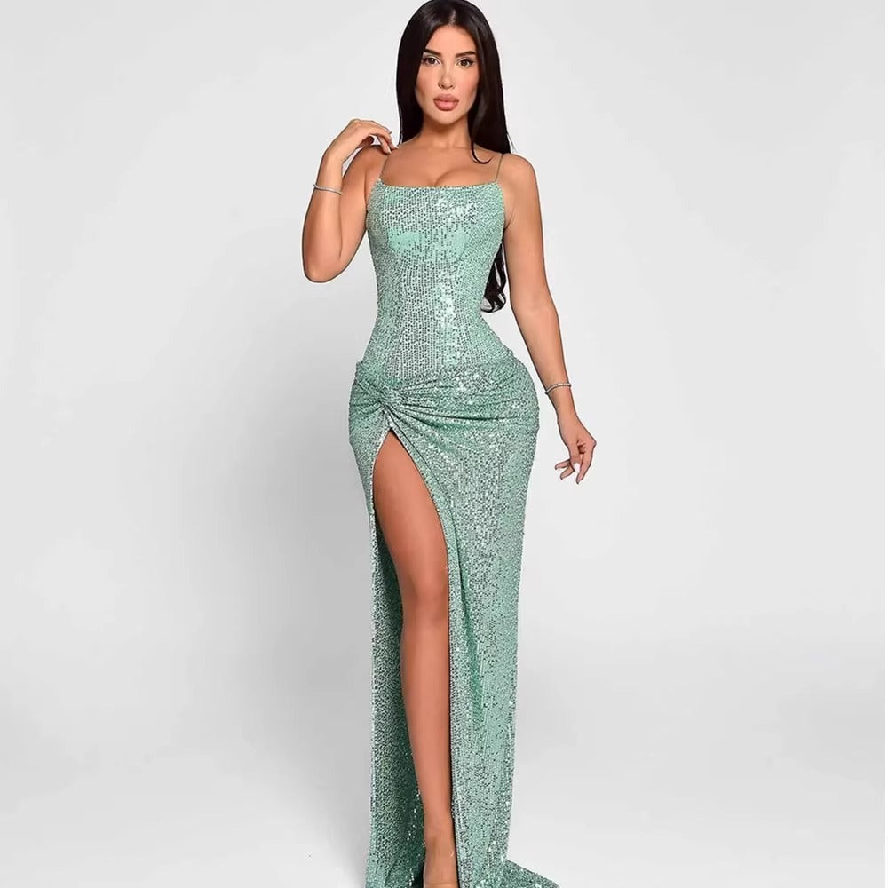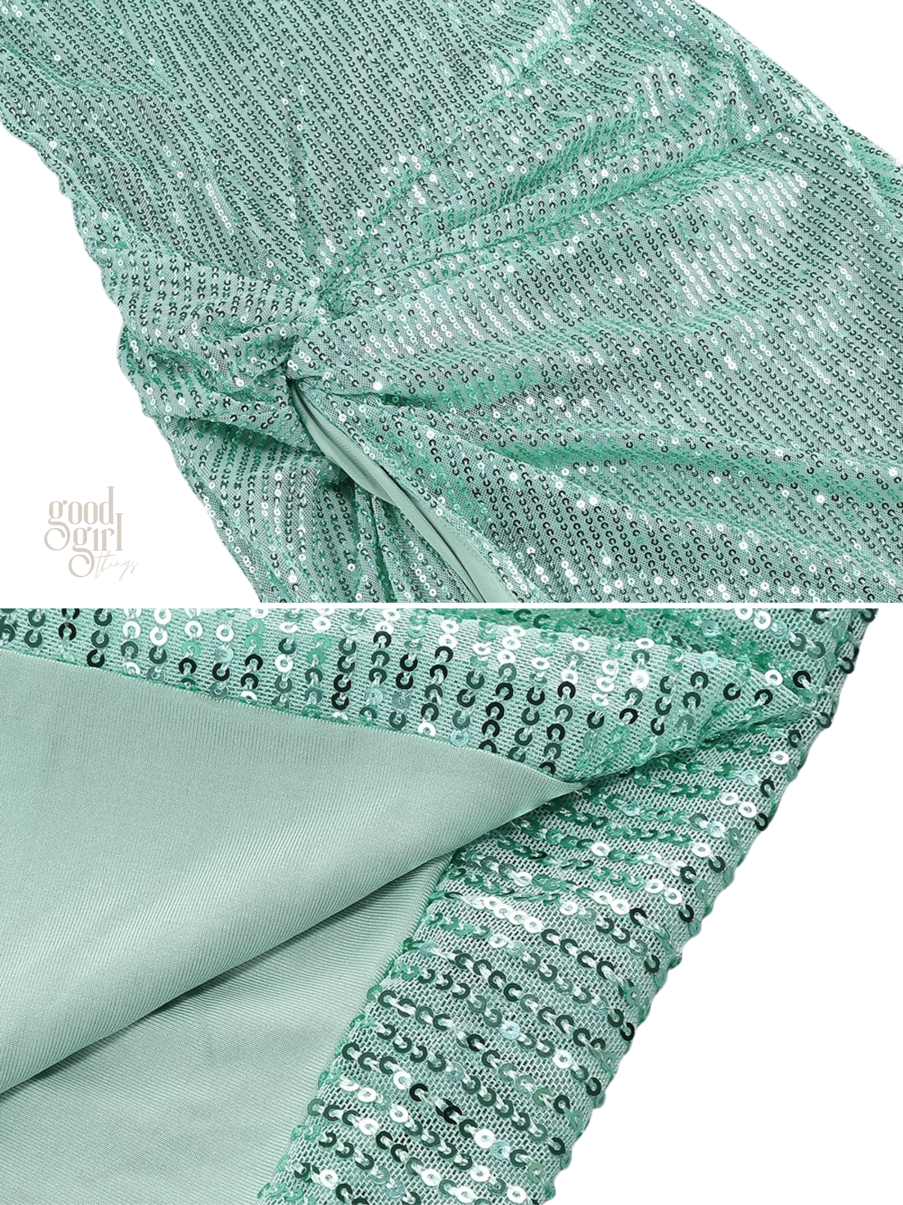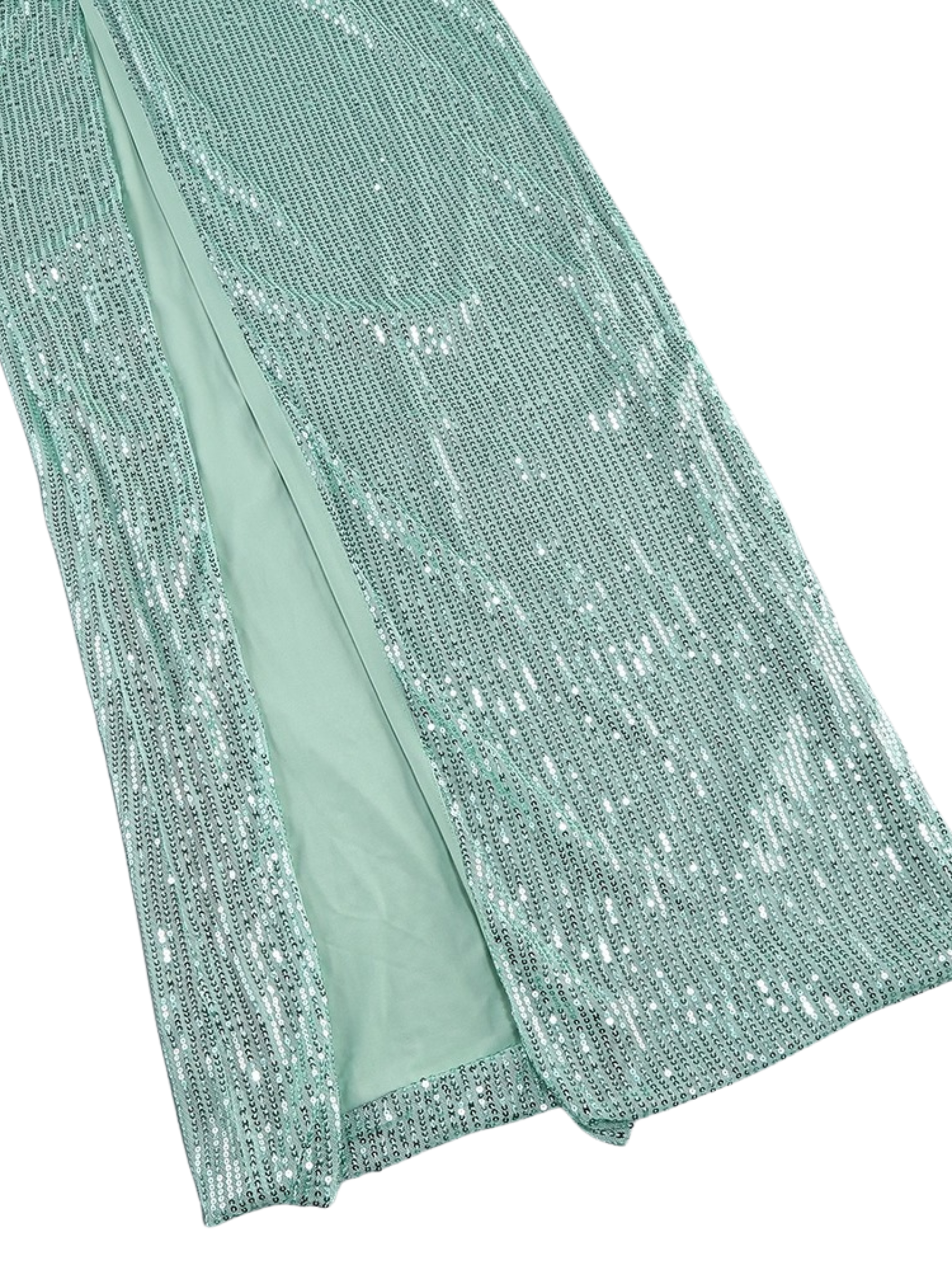 Dazzle with every step in this stunning seafoam green sequin gown. Designed to accentuate your curves, it features a flattering bodycon silhouette, ruched hip detail, and a thigh-high slit that brings the perfect dose of drama. The lace-up back adds a touch of sultry sophistication while allowing for an adjustable fit. Whether it’s prom, a gala, or a red carpet moment—this dress ensures all eyes stay on you.