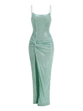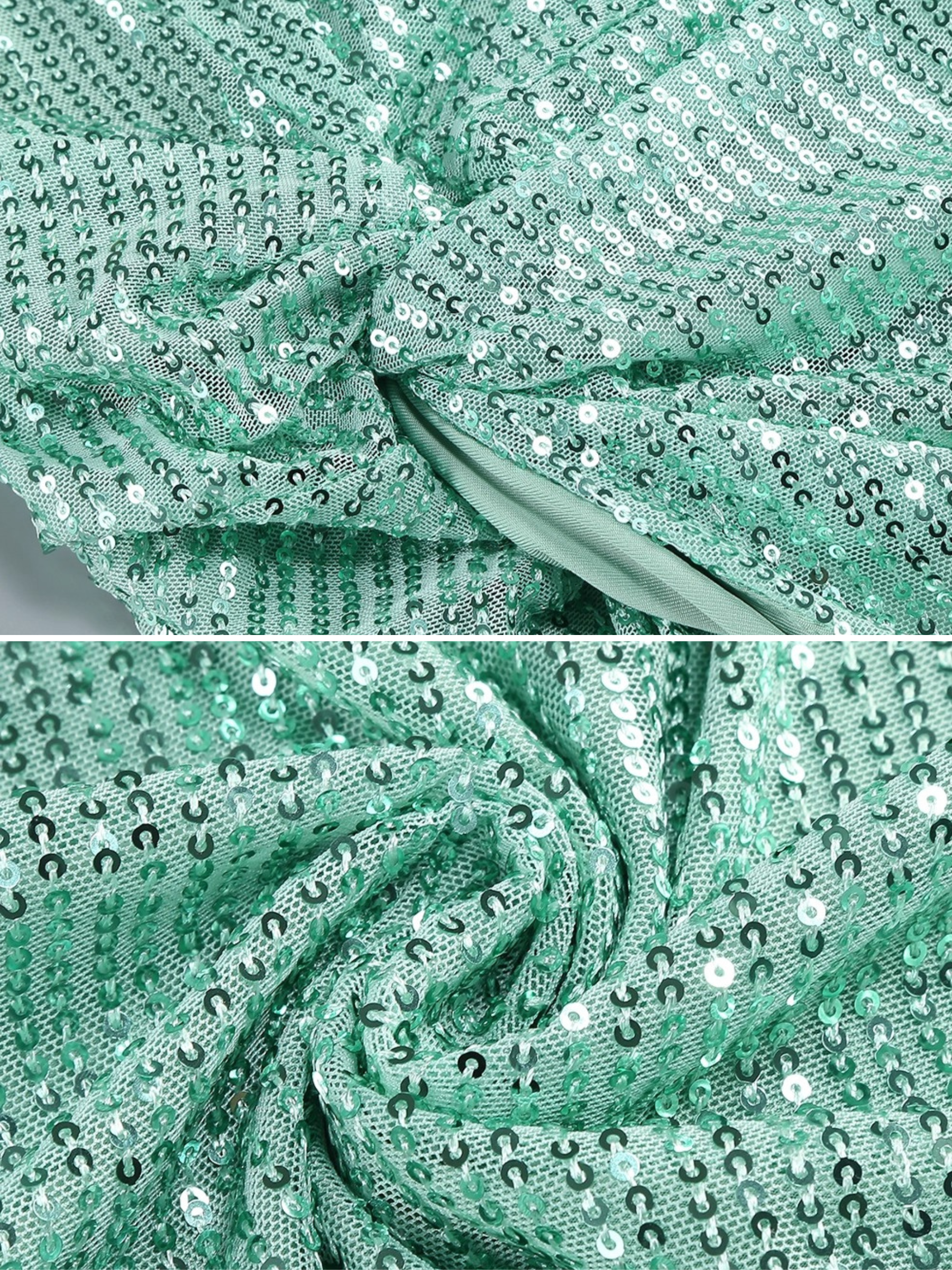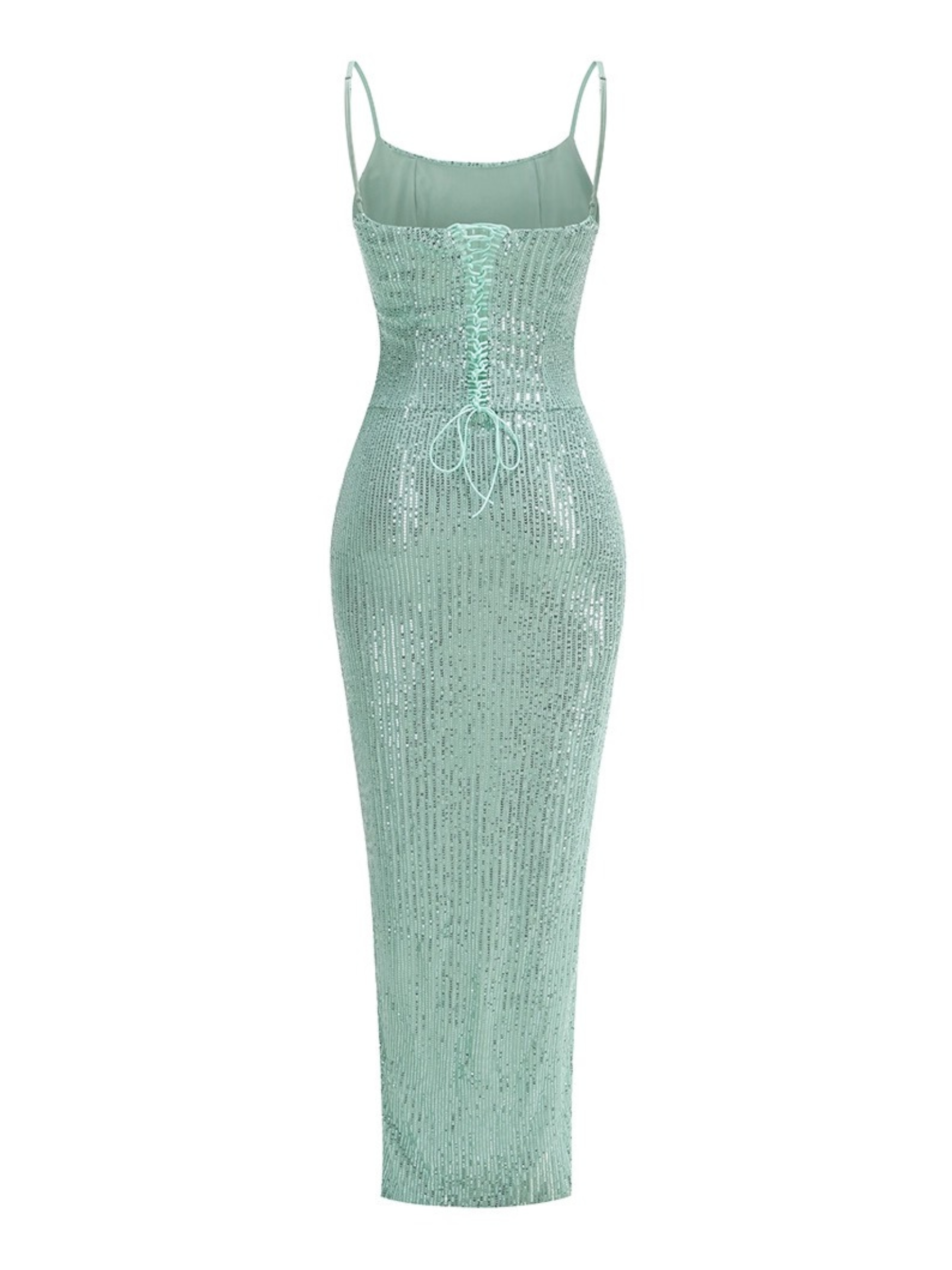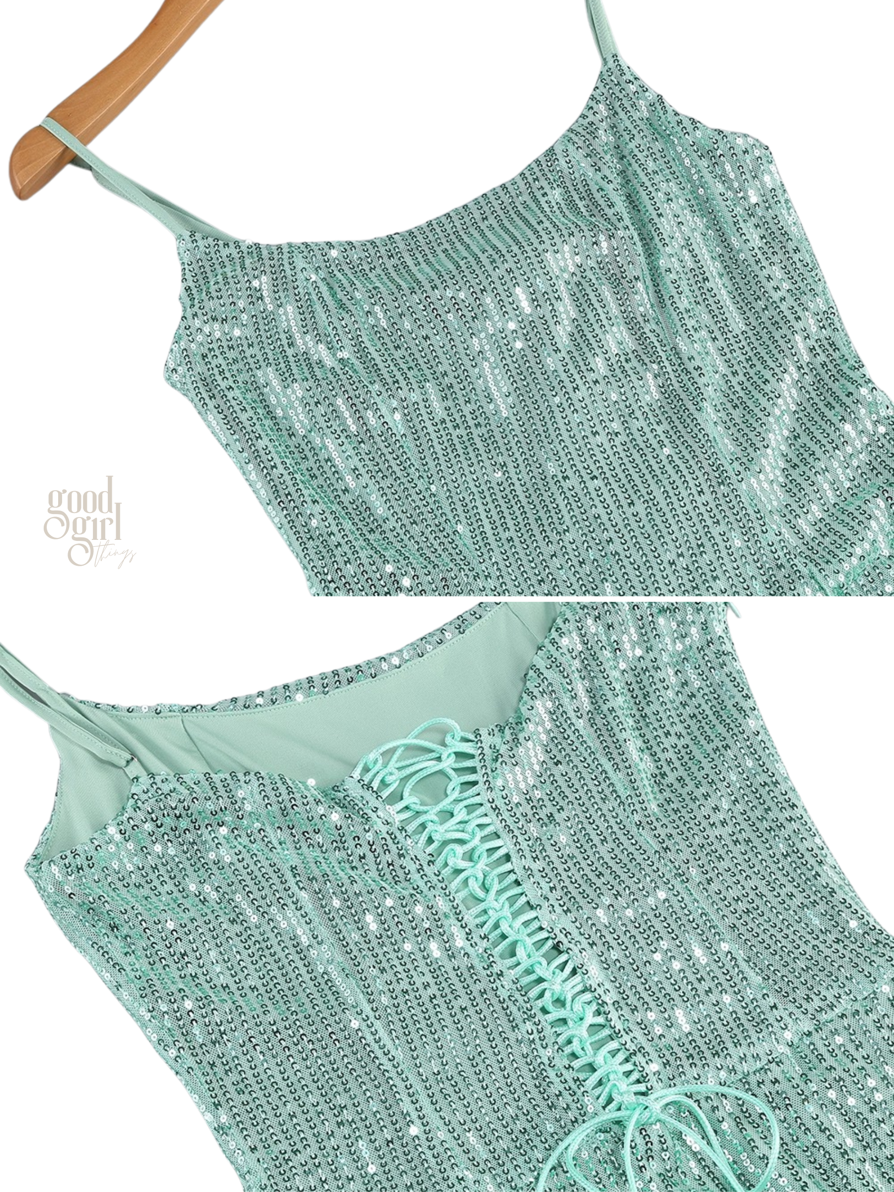Dazzle with every step in this stunning seafoam green sequin gown. Designed to accentuate your curves, it features a flattering bodycon silhouette, ruched hip detail, and a thigh-high slit that brings the perfect dose of drama. The lace-up back adds a touch of sultry sophistication while allowing for an adjustable fit. Whether it’s prom, a gala, or a red carpet moment—this dress ensures all eyes stay on you.