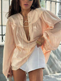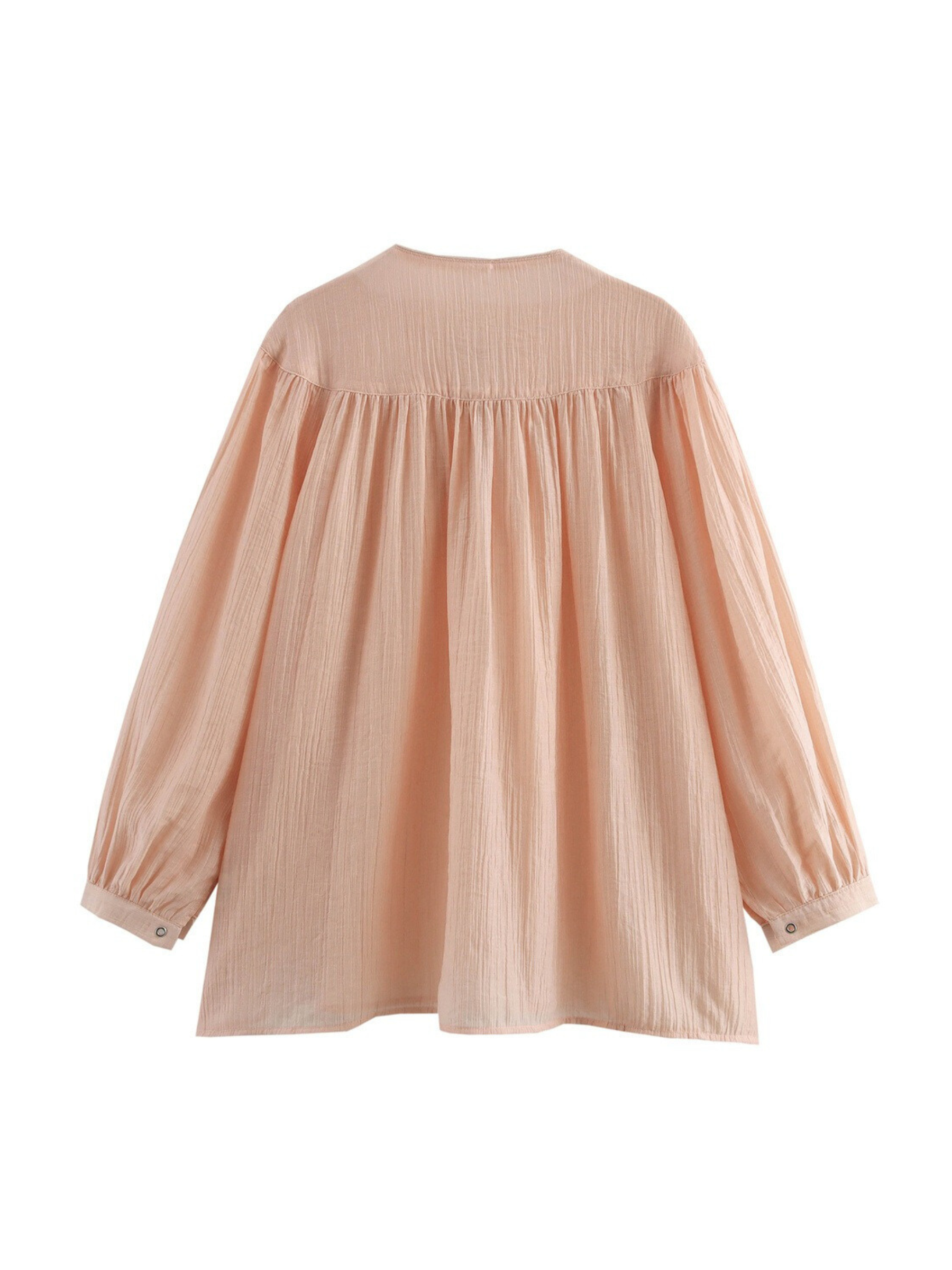 Heaven Crinkled Tie-Front Top brings a touch of effortless cool to your wardrobe. Crafted in a delicate pink hue, this long-sleeved pullover features a captivating crinkled texture that adds depth and movement. The relaxed silhouette is perfectly complemented by a playful front tie, allowing for versatile styling. Pairs perfectly with denim for a casual daytime look or can be elevated with sleek pants for a chic evening ensemble.