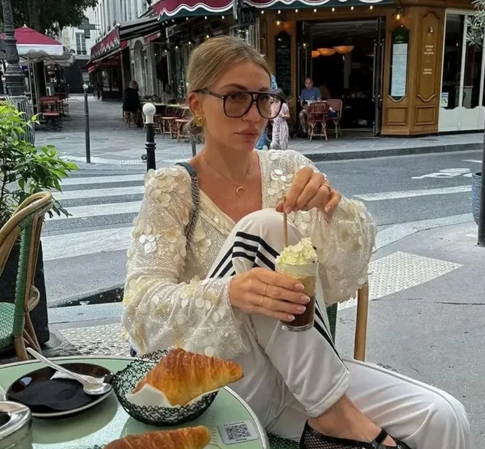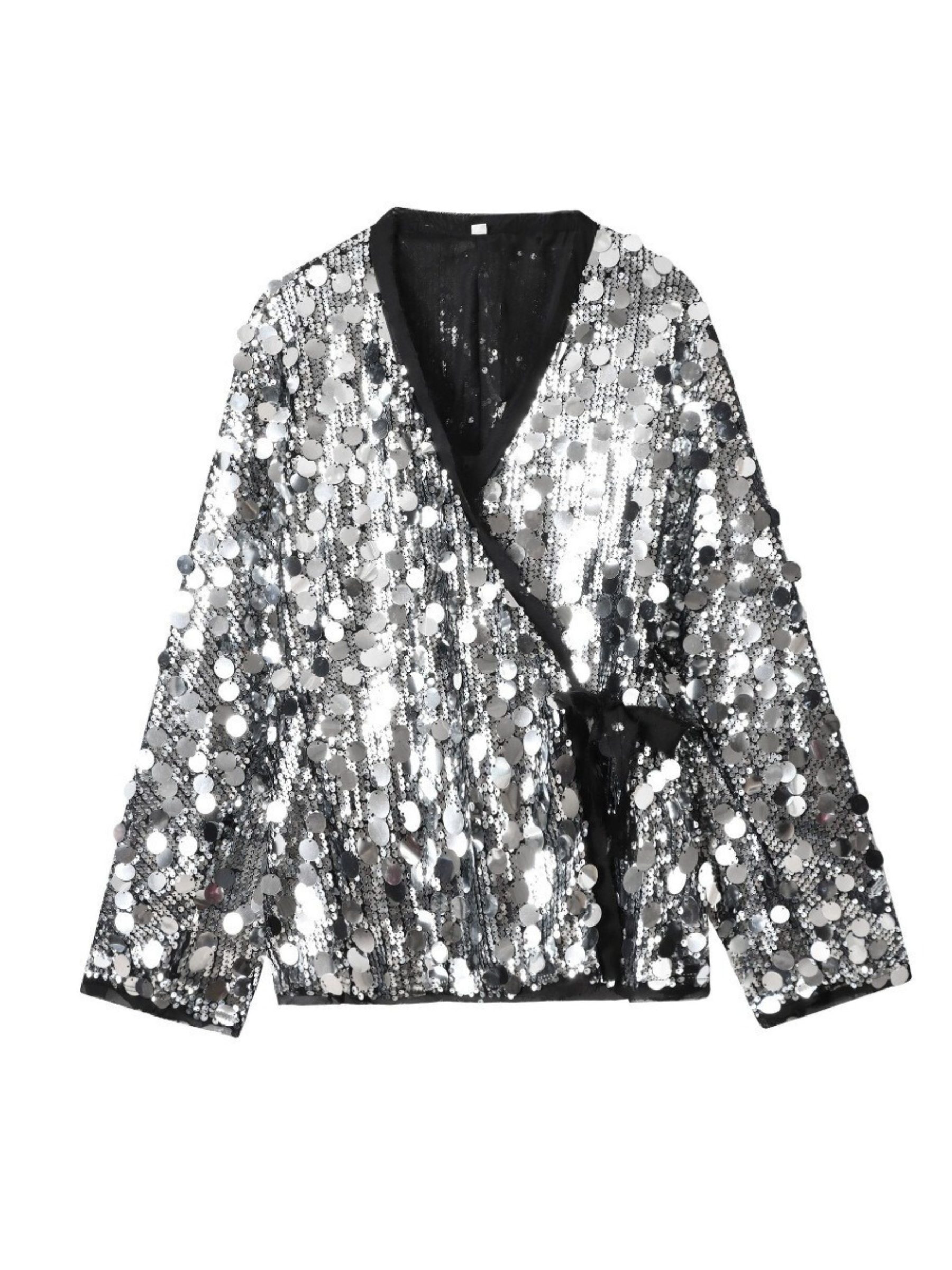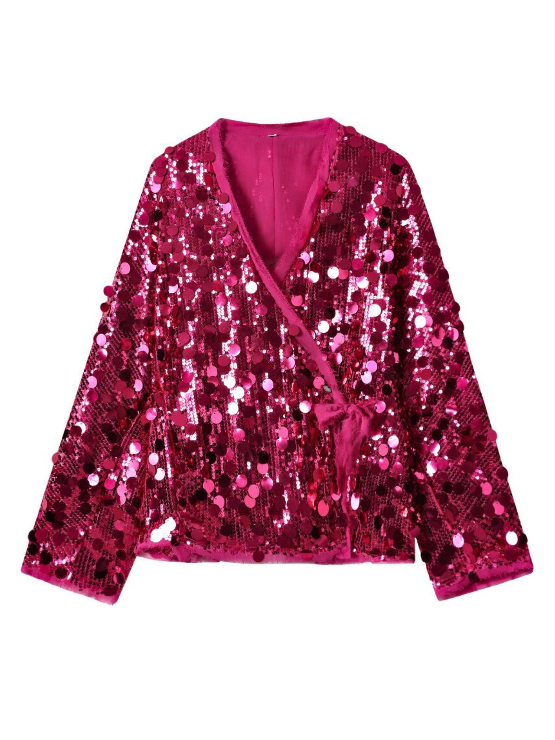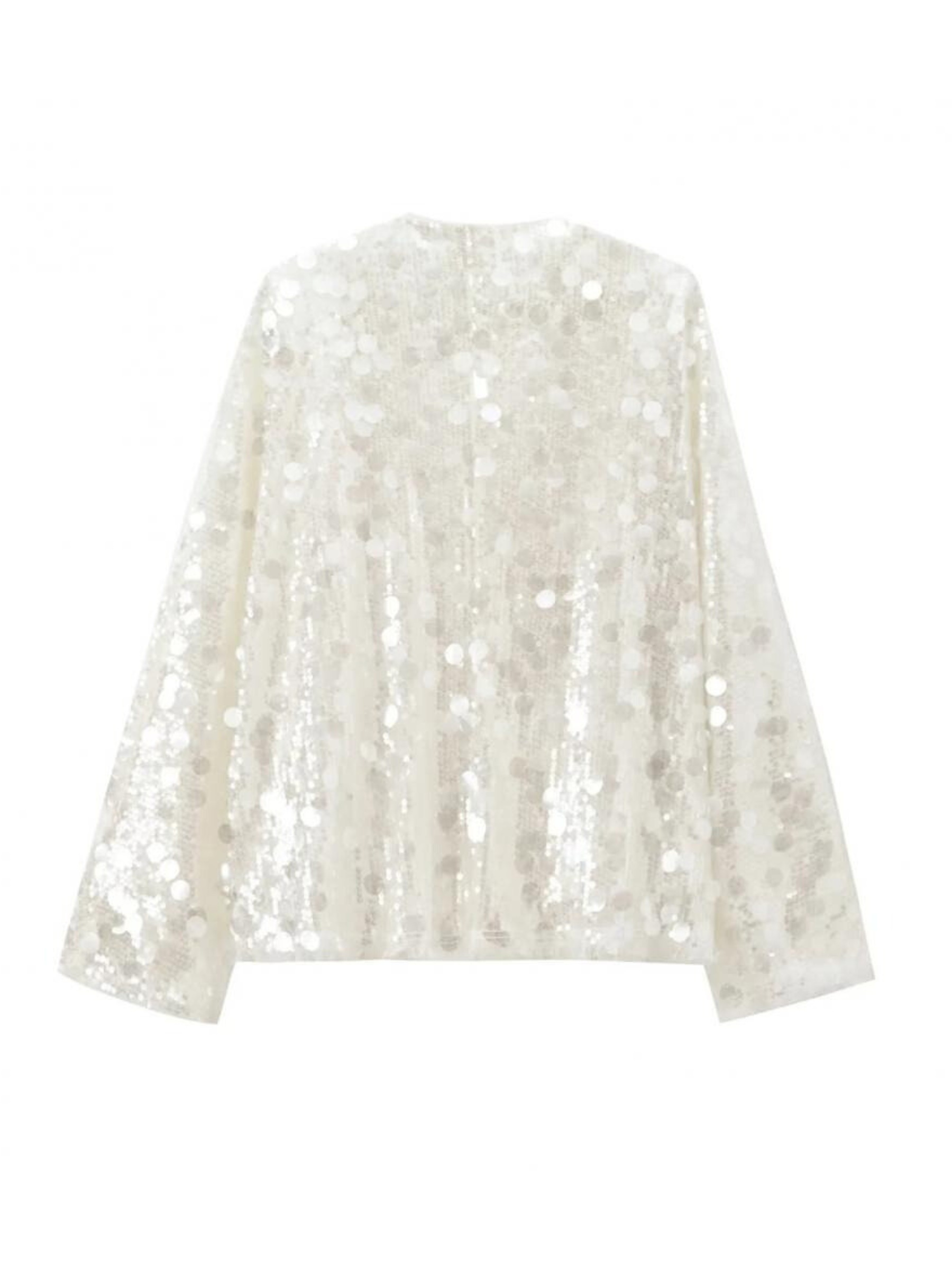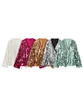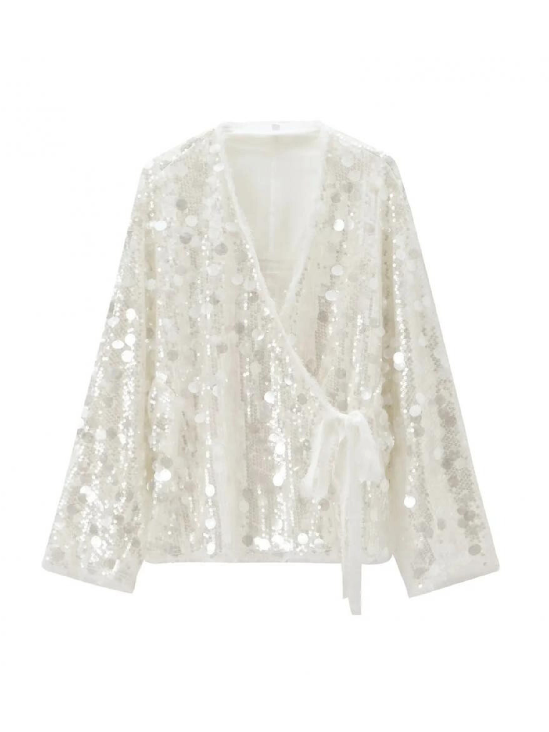 Presenting the Jaylie Sequin Kimono Top, a dazzling piece designed to make a statement. This radiant white top features a luxurious all-over sequin embellishment that catches the light with every movement. Its elegant kimono-style silhouette, complete with a flattering tie-front closure, offers a sophisticated yet playful vibe, perfect for an elevated evening look.