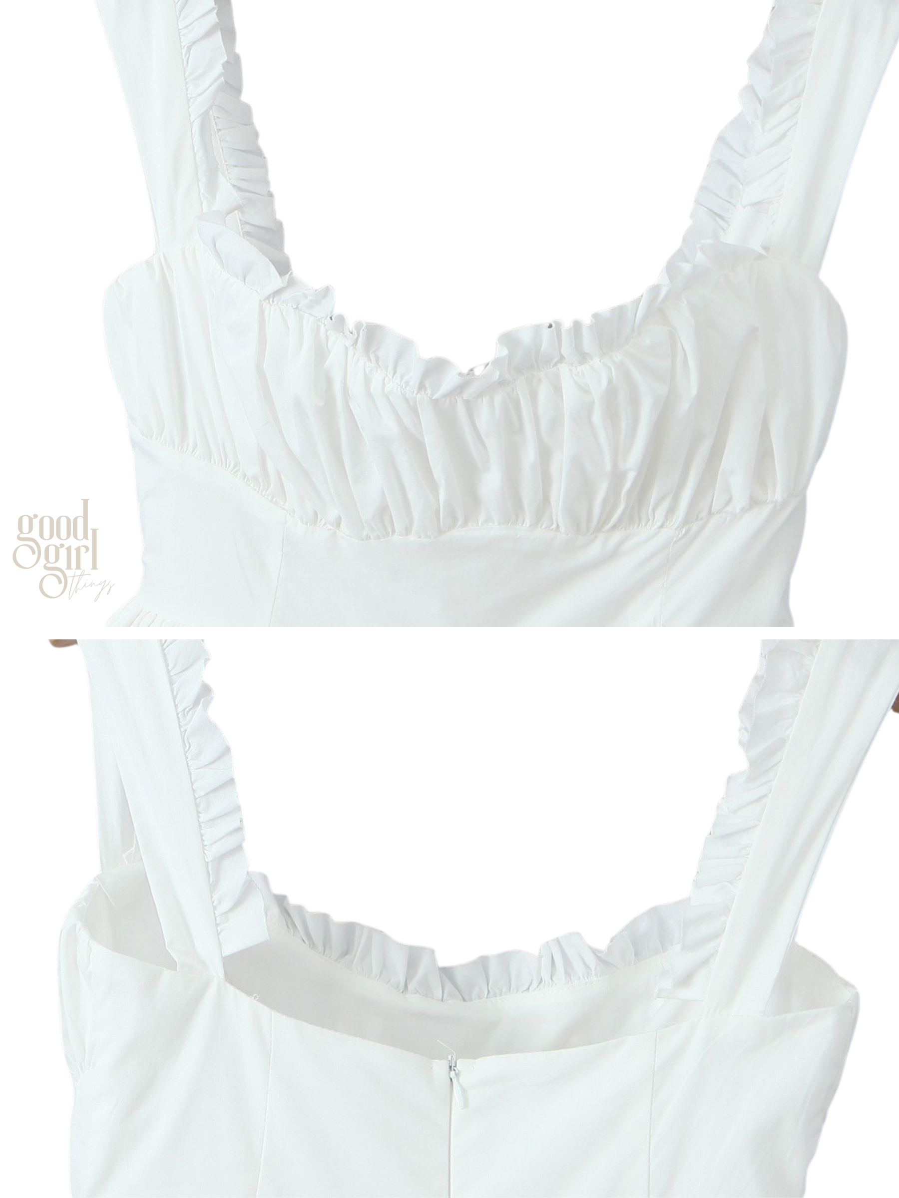 - Square neckline and delicate spaghetti straps.