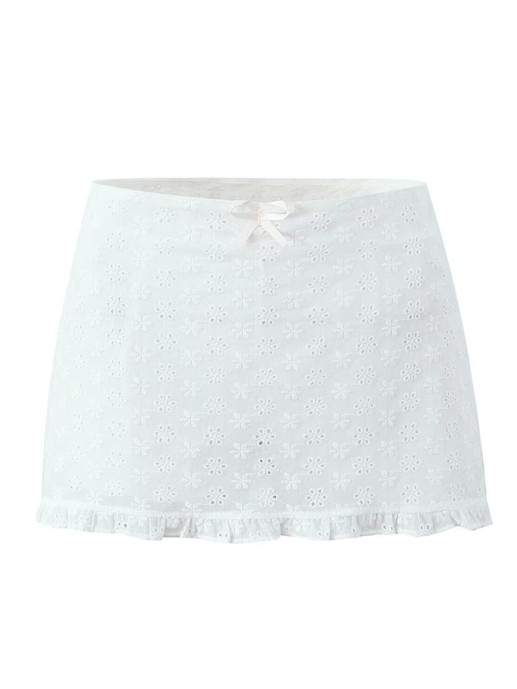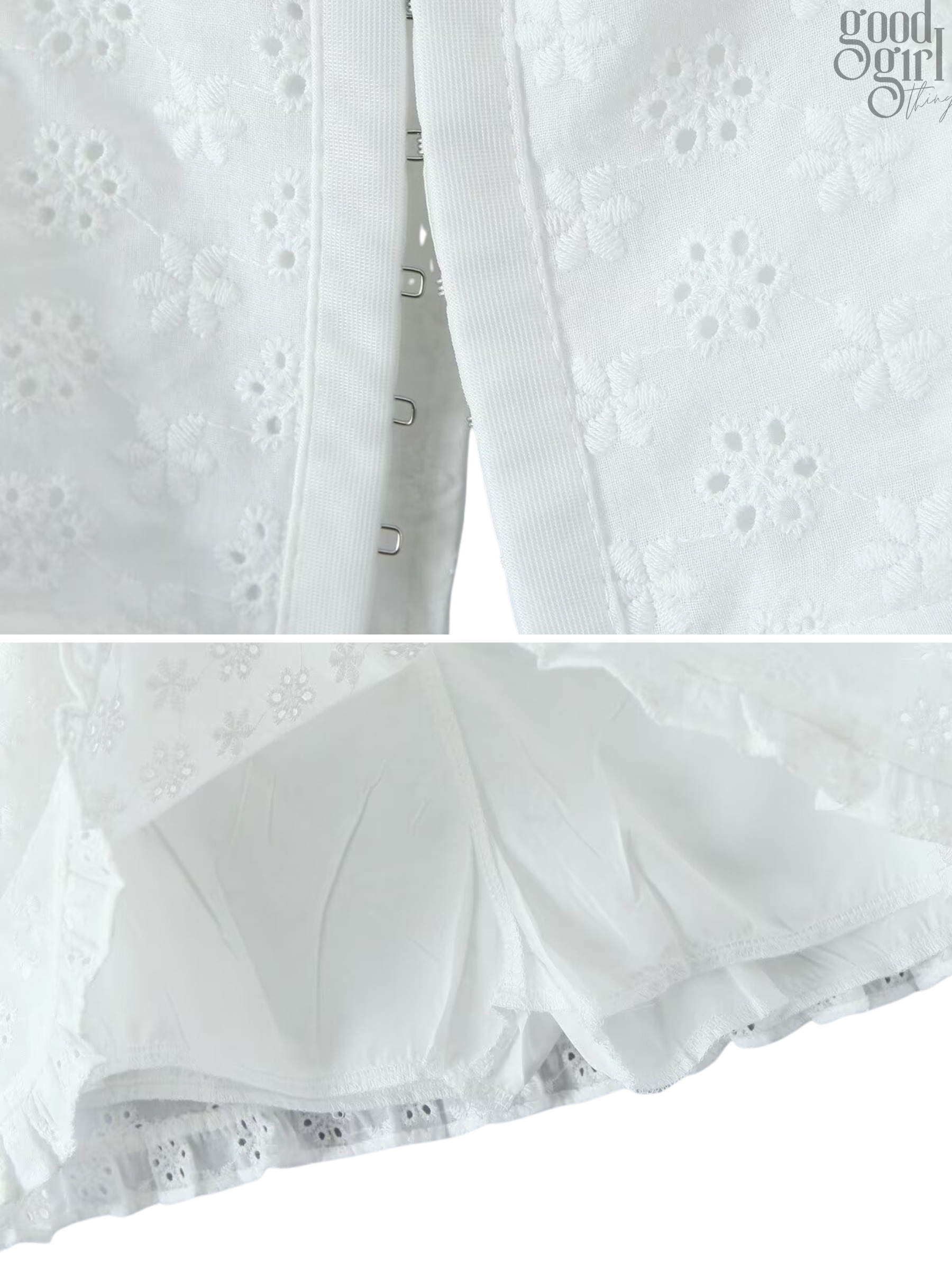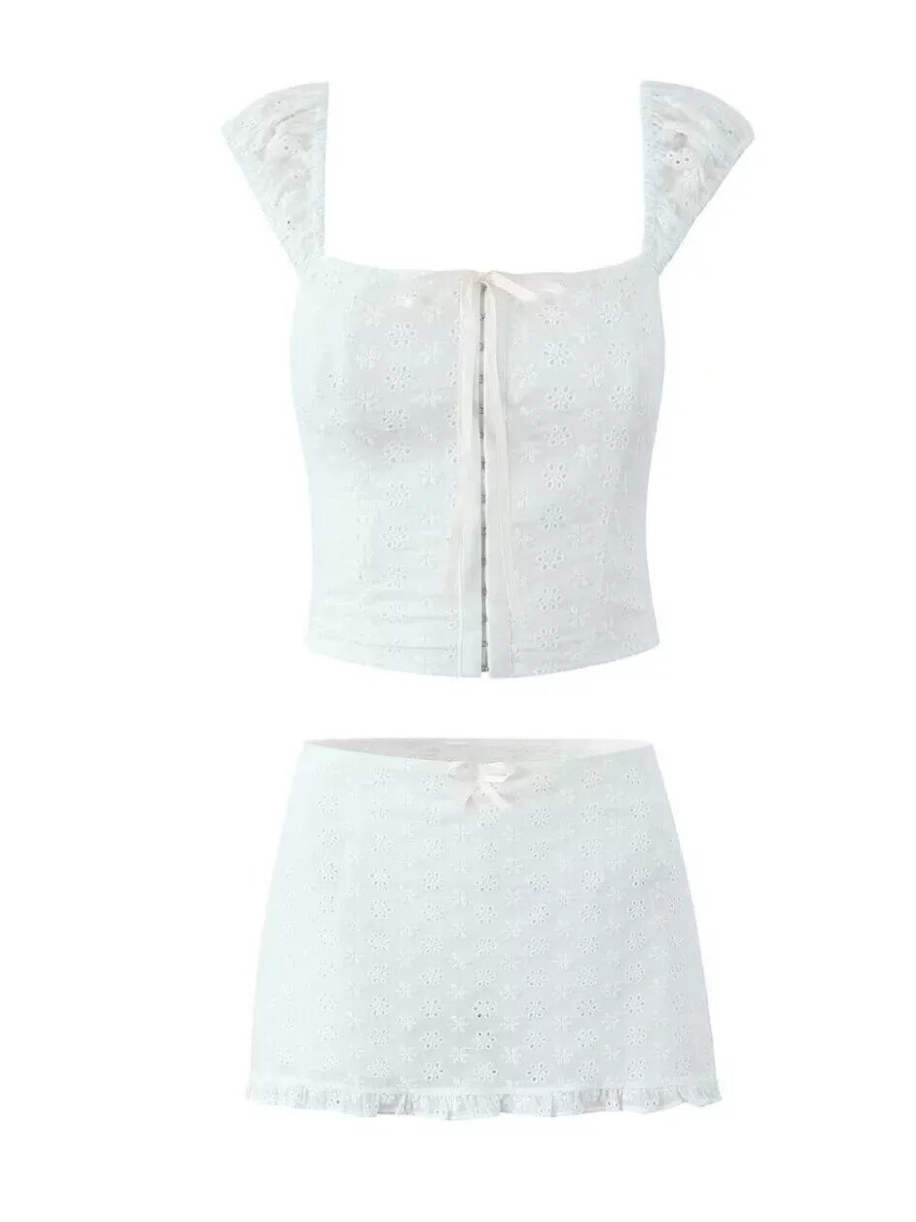 Introducing the Kelsea Embroidered Lace Skirt Set, a captivating white ensemble designed to infuse your wardrobe with delicate charm. This two-piece set features a sleeveless, backless crop top and a matching mini skirt, both adorned with intricate lace details. Its sweet silhouette makes it a perfect choice for sun-drenched days or elegant evening occasions. Pairs beautifully with strappy sandals and a delicate clutch for an ethereal look.