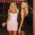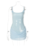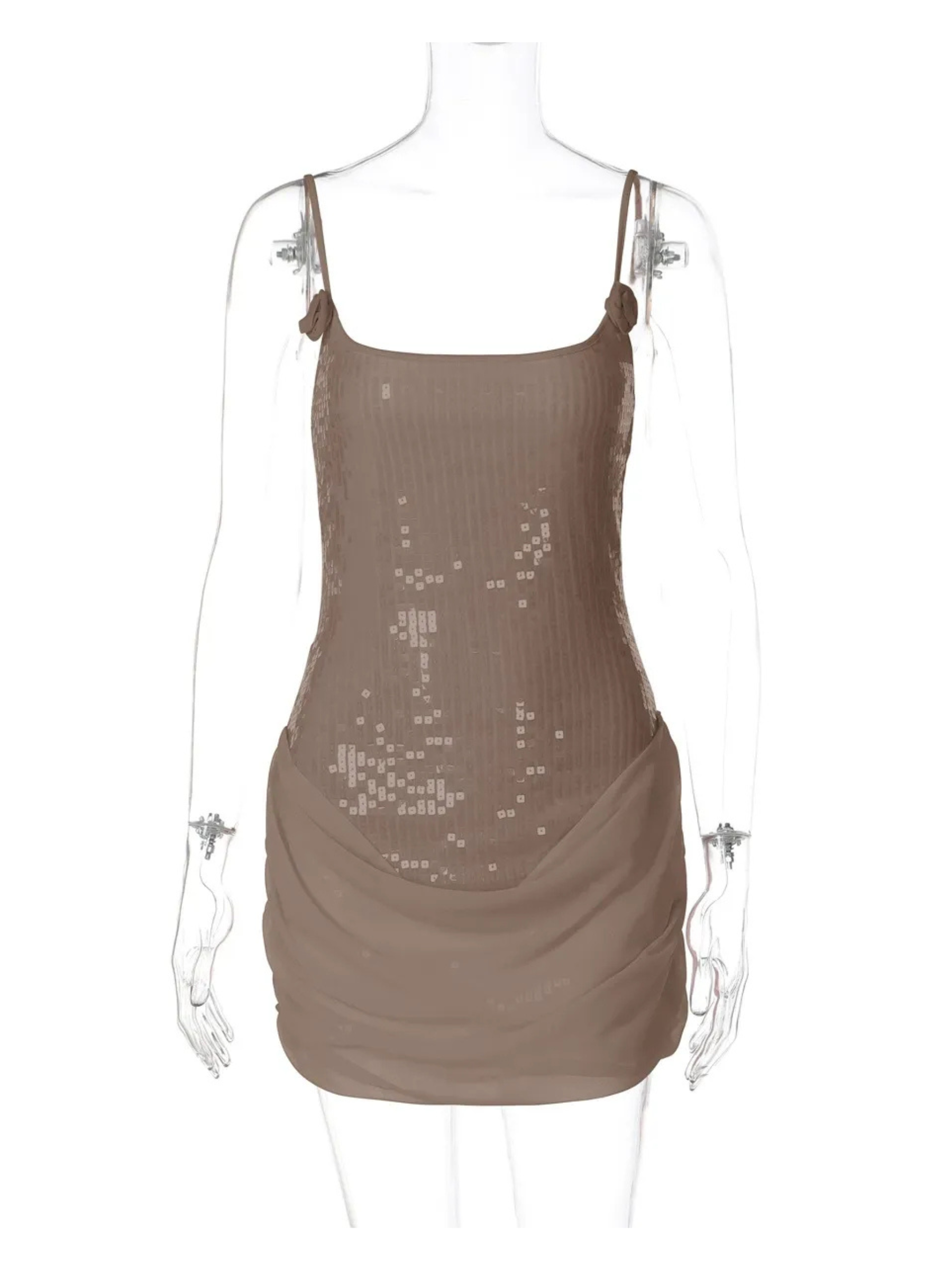 Made to shimmer under lights, this ultra-flattering mini dress features an allover sequin finish with a clean straight neckline and delicate spaghetti straps. Sweet rosette details at the straps add a feminine touch, while the sheer draped overlay at the skirt creates a soft ruched effect and dreamy movement. Sleek, body-hugging, and effortlessly party-ready—perfect for birthdays, nights out, and special occasions.