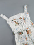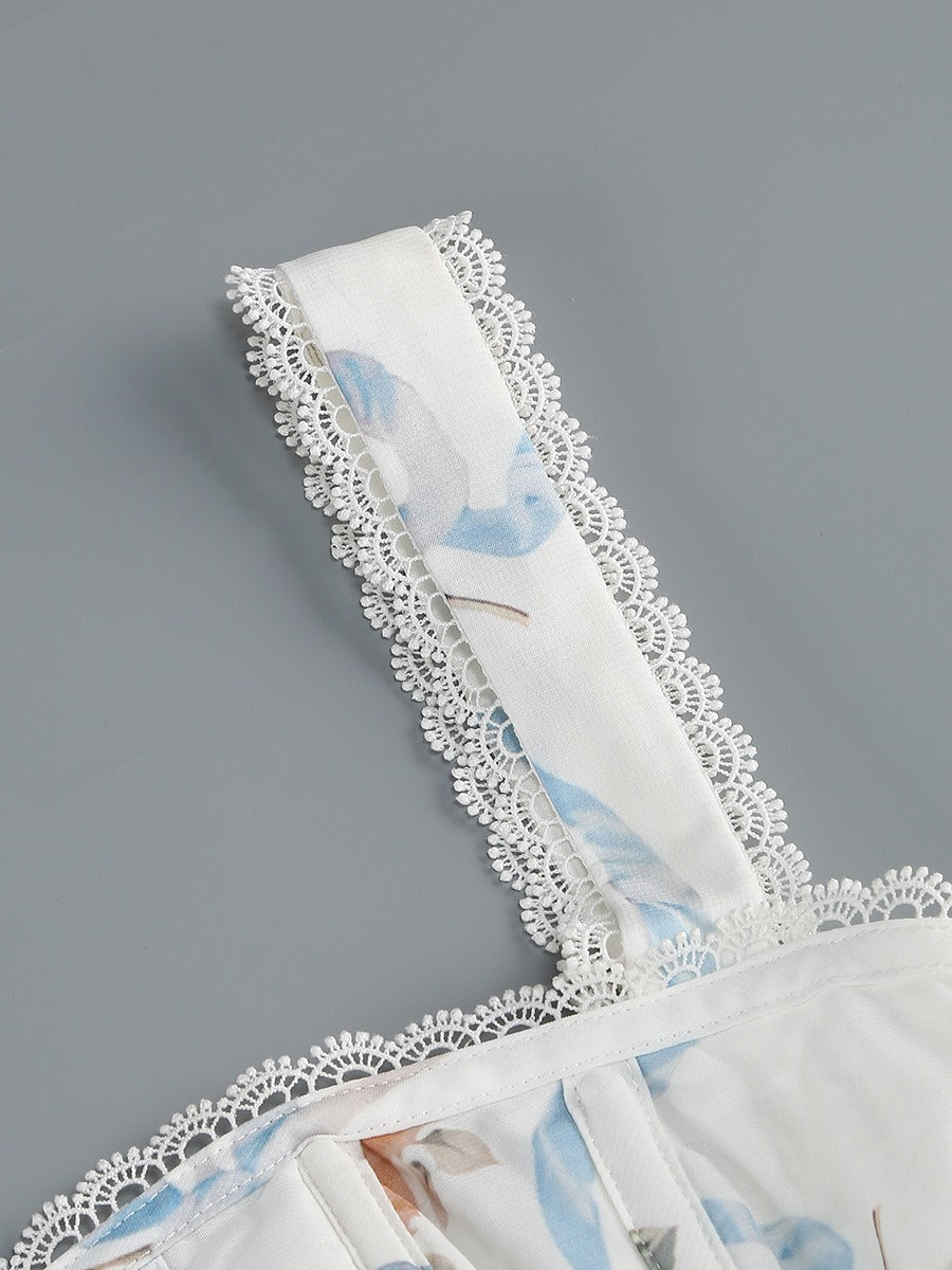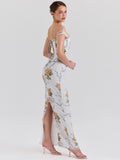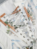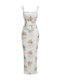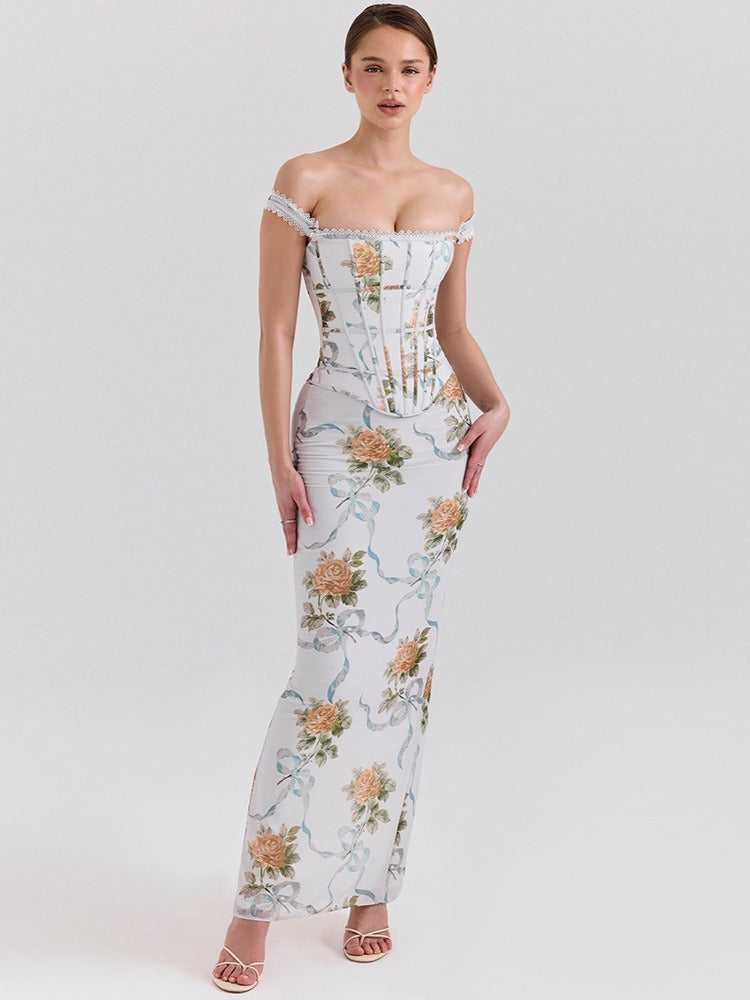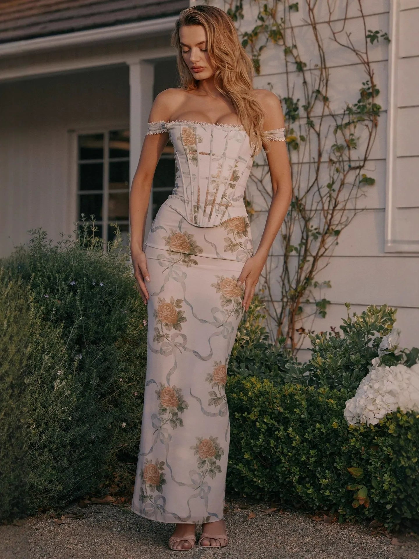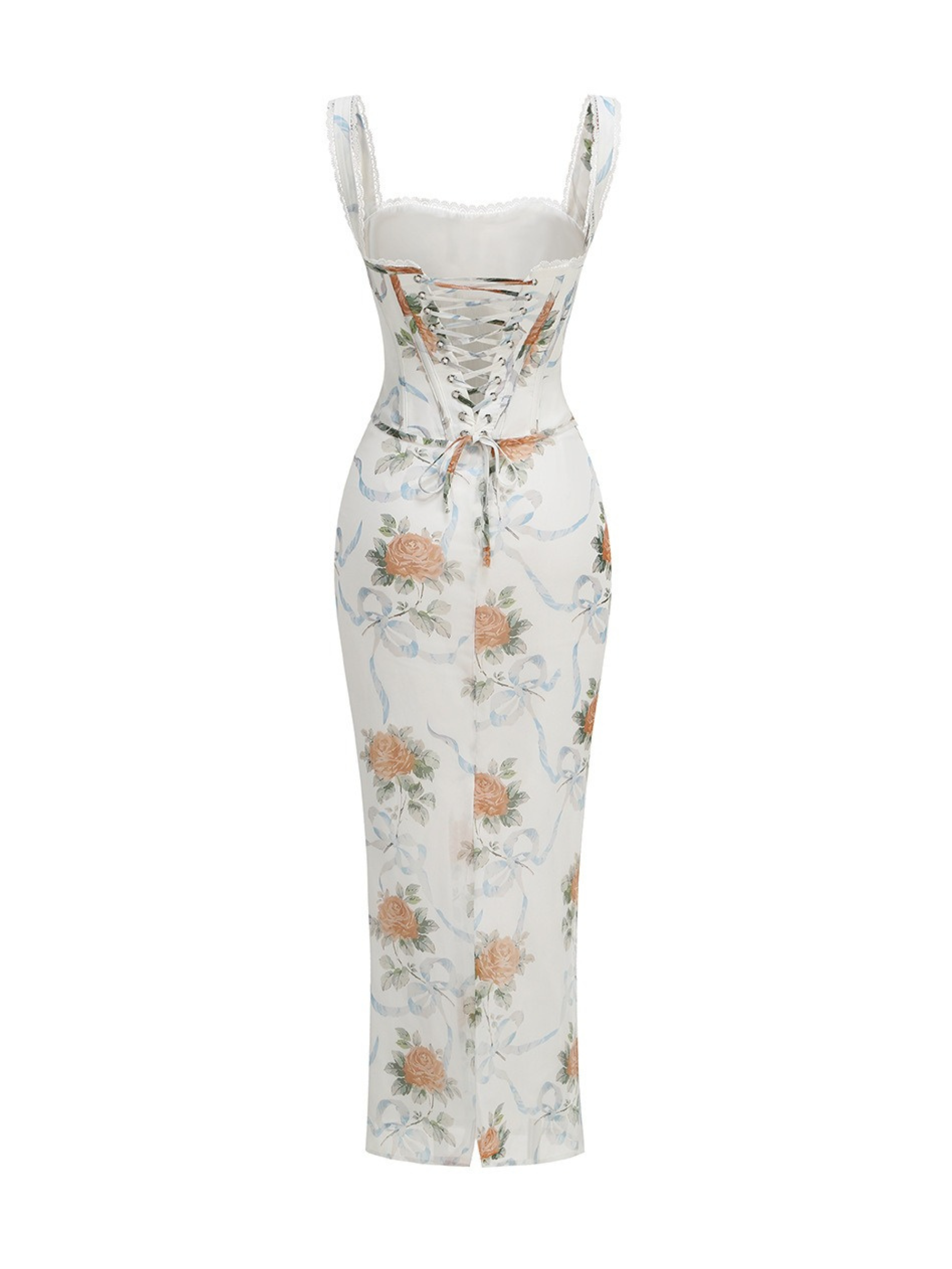 Romantic and couture-inspired, this corset maxi dress features a delicate rose bouquet print intertwined with soft ribbon details for a true fairytale finish. The structured bodice is designed with defined corset seaming and a lace-trim neckline to shape and support, while the lace-up back lets you customize the fit and cinch the waist. Finished in a sleek, elongated maxi length, it’s made for garden parties, bridal moments, and dreamy vacations.