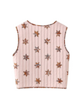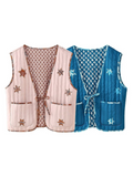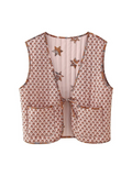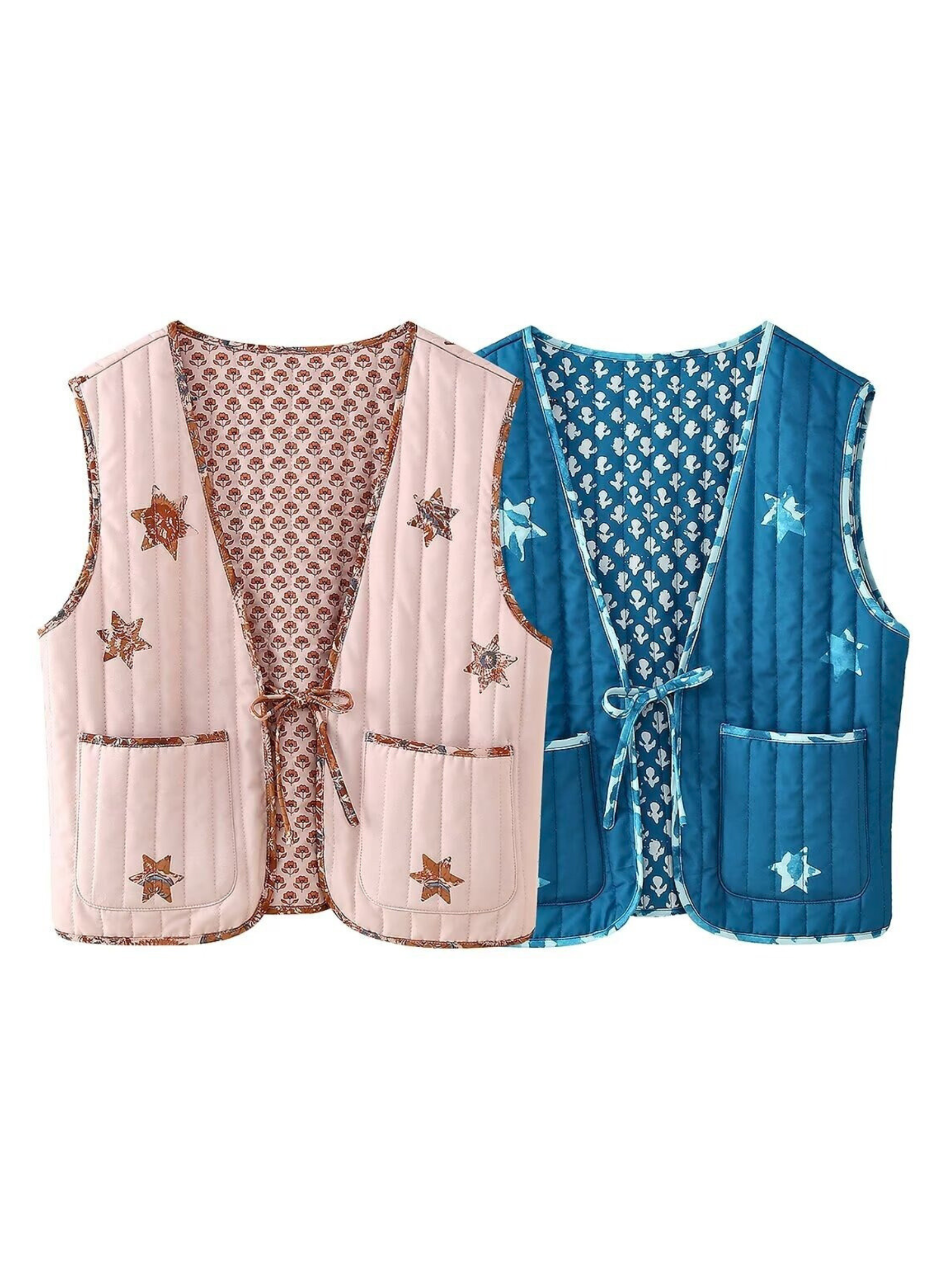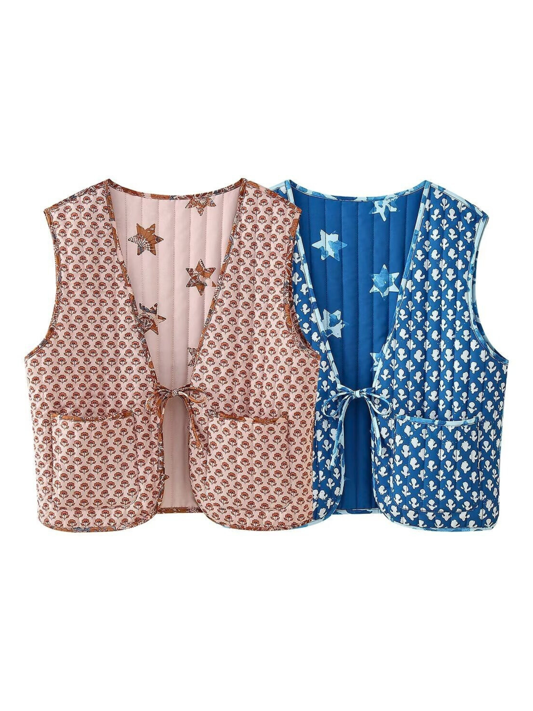 Elevate your layering game with the Mana Reversible Quilted Vest, a versatile piece designed for the modern trendsetter. This stylish vest features an eye-catching abstract print in both blue/white and pink/orange palettes, offering two distinct looks in one. Crafted with a cozy quilted texture and a chic V-neckline, it effortlessly blends comfort with high-fashion appeal. Layer it over a crisp white tee and denim for a relaxed daytime ensemble, or pair with a long-sleeve top and sleek leather pants for an elevated evening out.