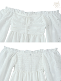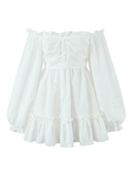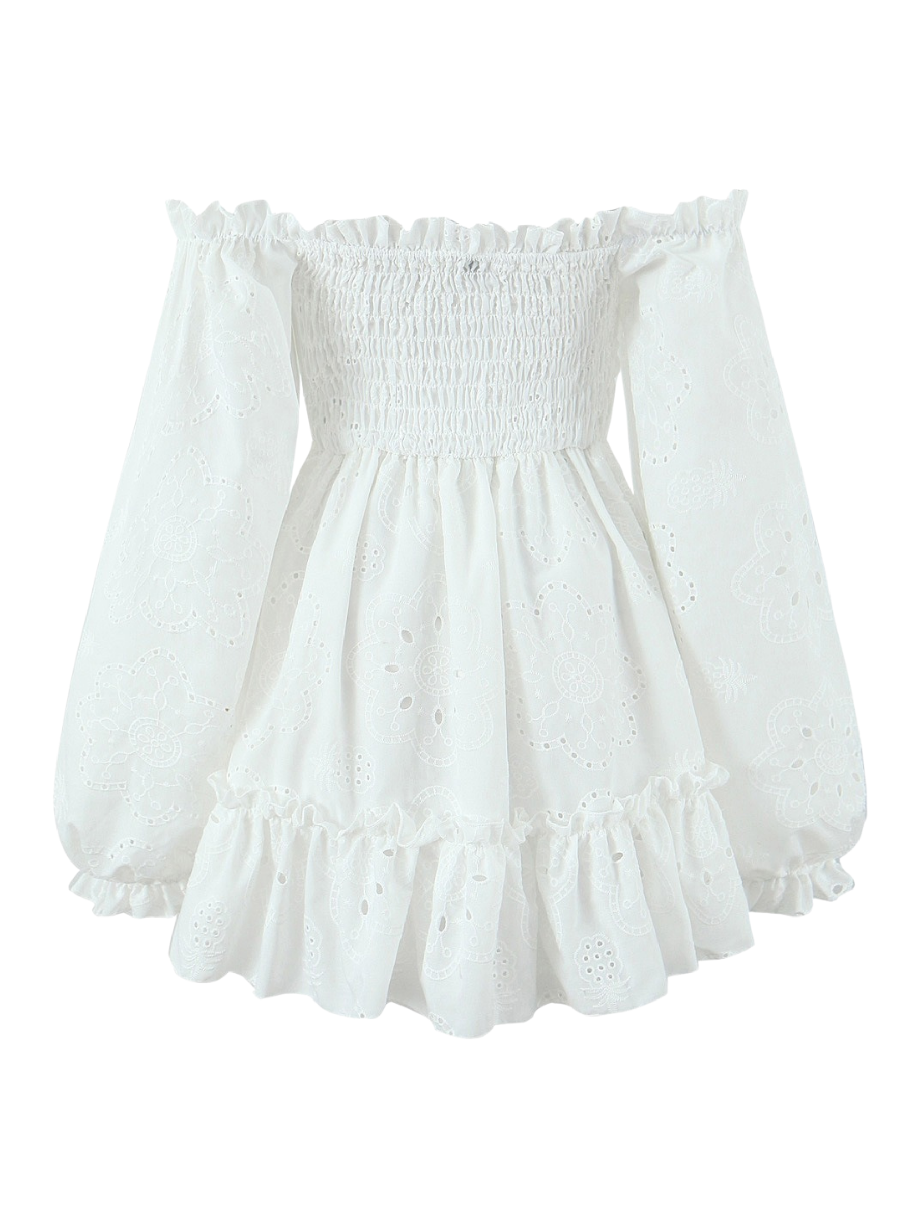 Embrace effortless charm with the Nairobi Off Shoulder Ruffle Mini Dress. This pristine white design captivates with its flattering V-neckline, beautifully accentuated by delicate ruffle trim. Long lantern sleeves add a touch of romantic elegance, flowing gracefully into a subtle A-line silhouette that flatters every figure. Perfect for a chic daytime event or an evening soirée, this dress ensures you make a memorable statement.