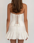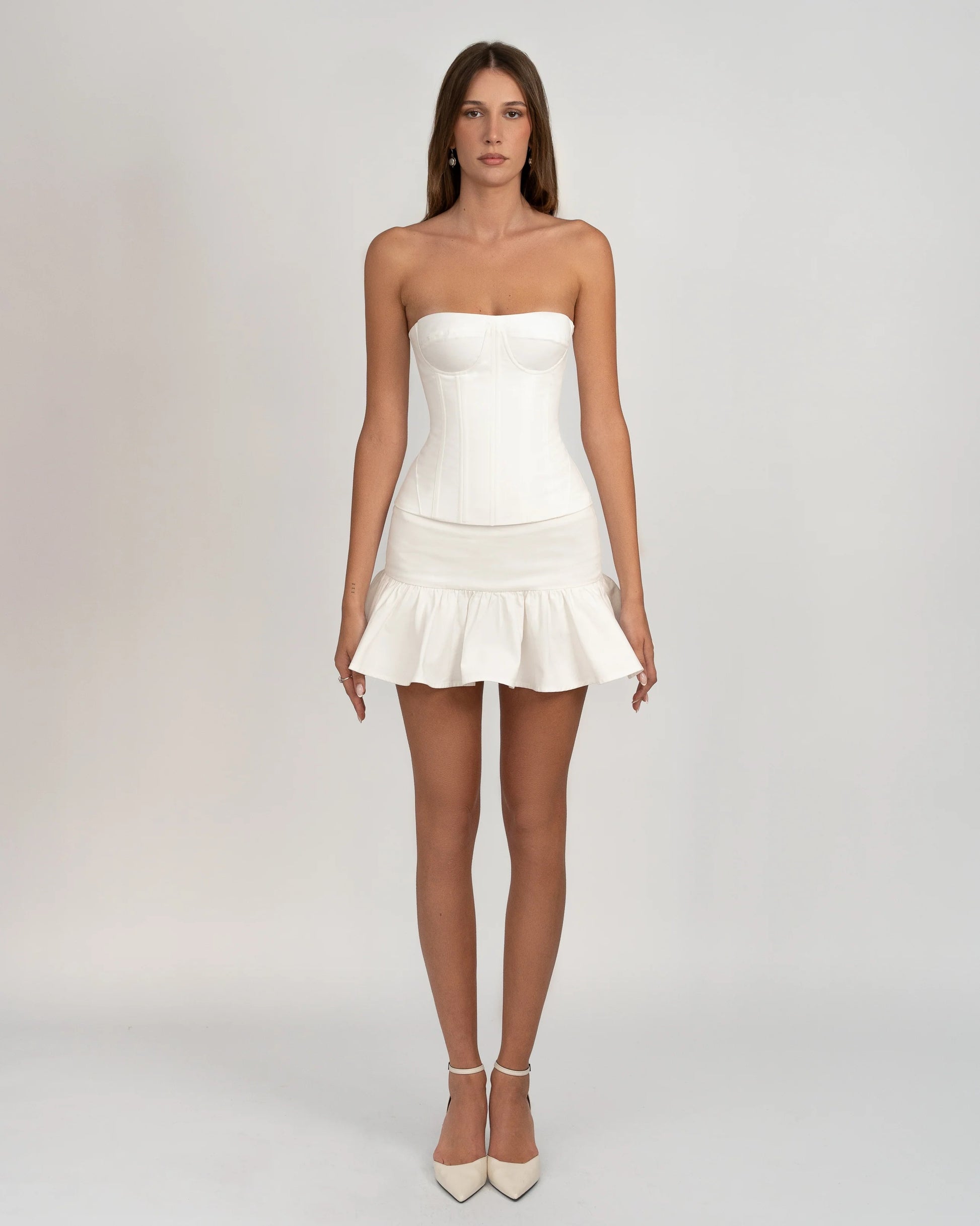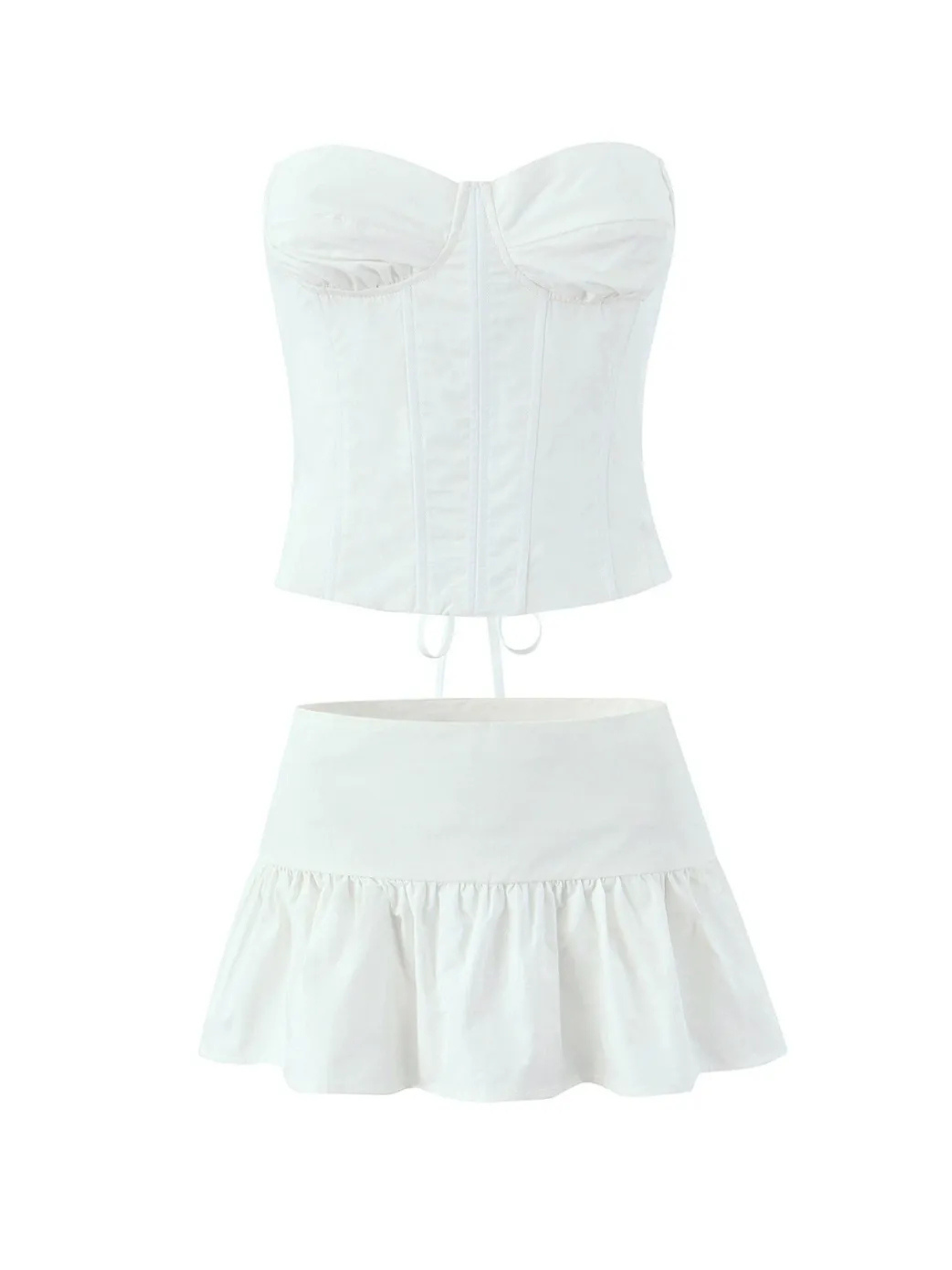 Step into the spotlight with the Natania Corset Top & Mini Skirt Set, designed for the confident and chic. This pristine white two-piece ensemble captures an effortlessly alluring vibe, featuring a captivating cropped top and a matching mini skirt. The top showcases delicate strappy detailing and a structured fishbone design, creating a flattering, slim silhouette that beautifully highlights the figure. An alluring open back adds a touch of modern sophistication, making this set a true statement piece for any occasion.