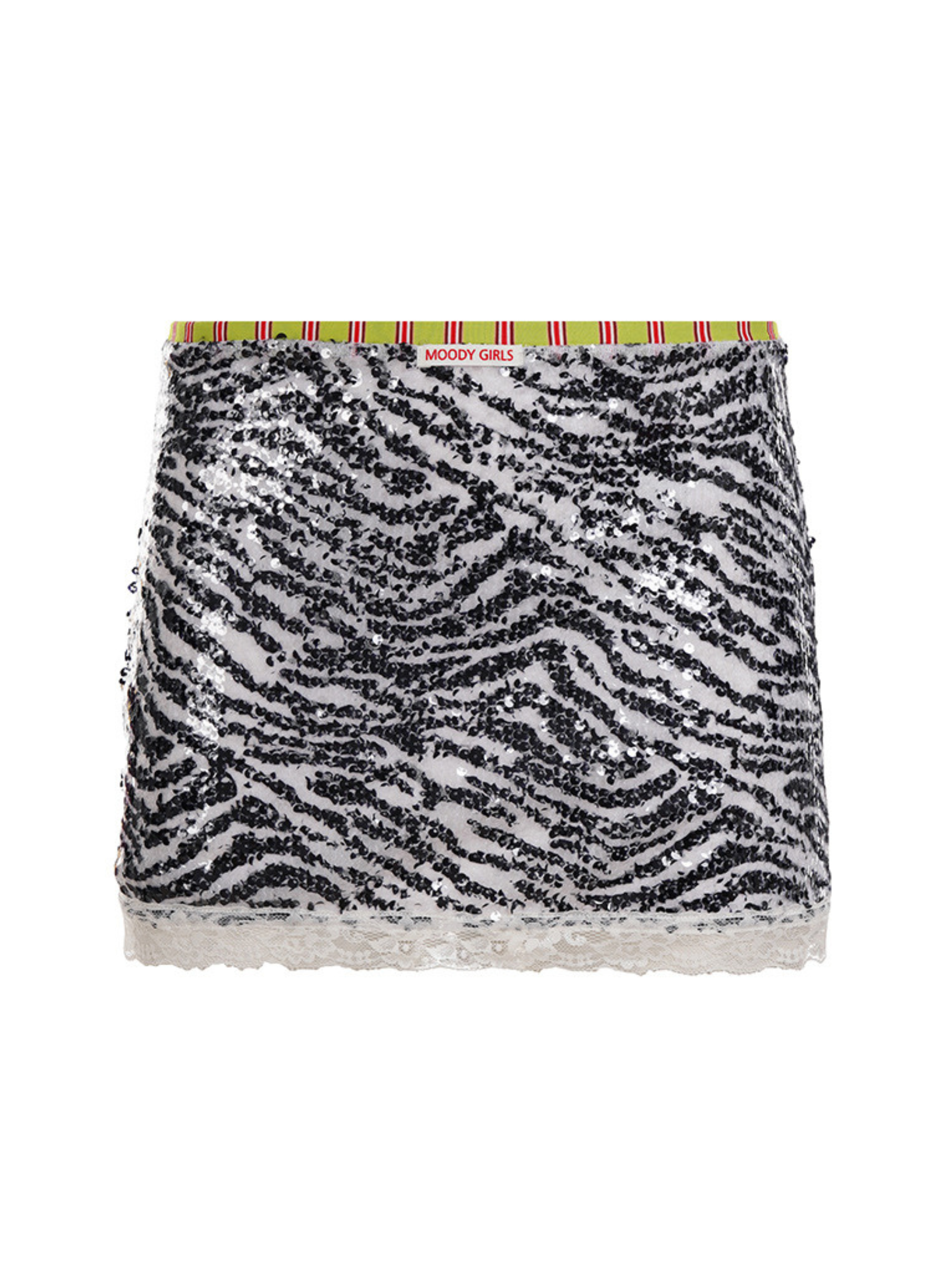 Unleash your wild side with the Paisley Zebra Sequin Mini Skirt, a daring piece designed to make a statement. This bodycon mini skirt features a captivating zebra print, meticulously adorned with shimmering sequins that catch the light with every move. Available in classic black and an alluring green, its short silhouette and delicate lace trim at the hem exude an edgy yet sophisticated charm. Perfect for a night out or a glamorous event, pair it with a sleek crop top and heels.