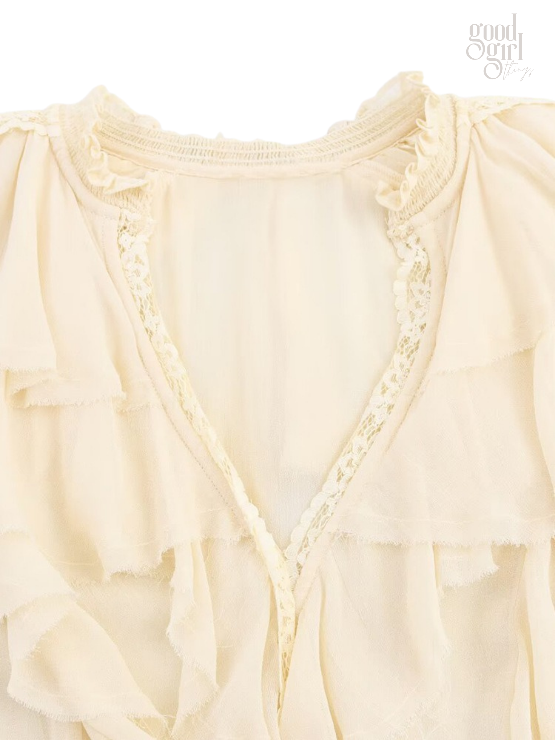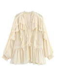 Embrace an air of delicate sophistication with the Passion Layered Lace Blouse. Crafted in a soft, ethereal Apricot hue, this piece exudes timeless charm. Its elegant V-neckline and gracefully layered lace details create a silhouette that's both flattering and subtly romantic, perfect for elevating any ensemble. Pairs effortlessly with tailored trousers for an office-chic look or with a denim skirt for a refined casual outing.