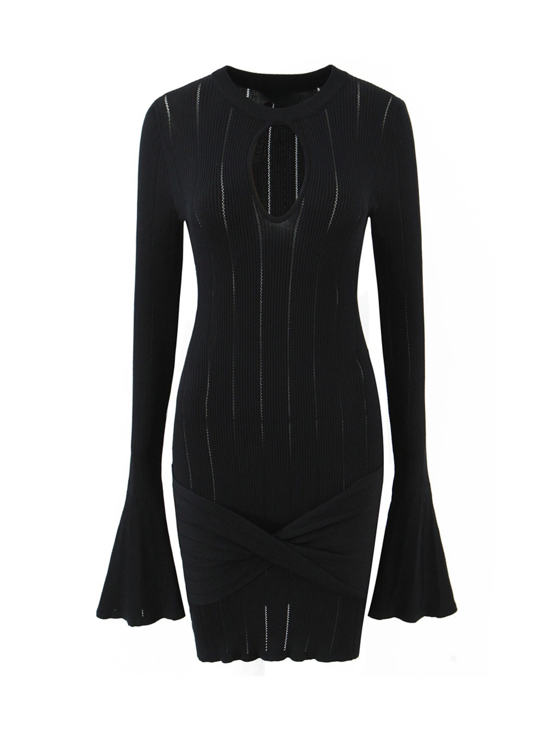 Introducing the Raylyn Cut-Out Knit Mini Dress, a modern essential designed to highlight your silhouette. This captivating bodycon features a sophisticated round neckline and long flared sleeves, ensuring an elegant yet playful aesthetic. Delicate cut-outs on the sides add a touch of allure, perfectly balanced by its chic mini length. Available in classic black and a vibrant mustard green, this dress is ready to make a statement.