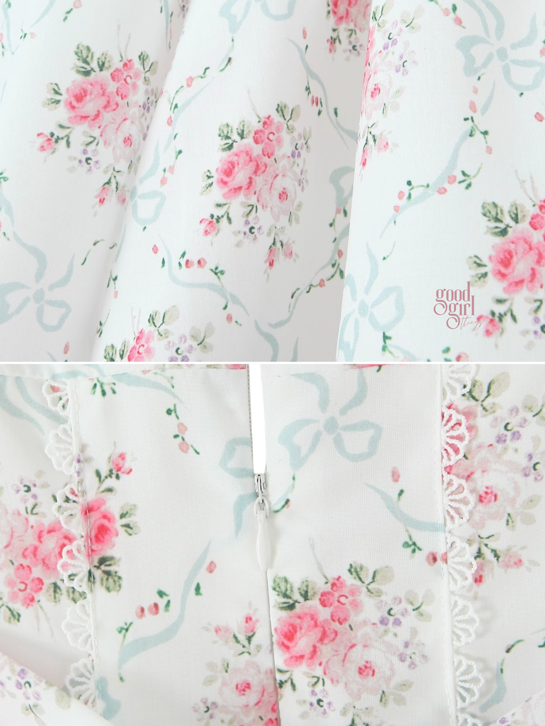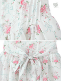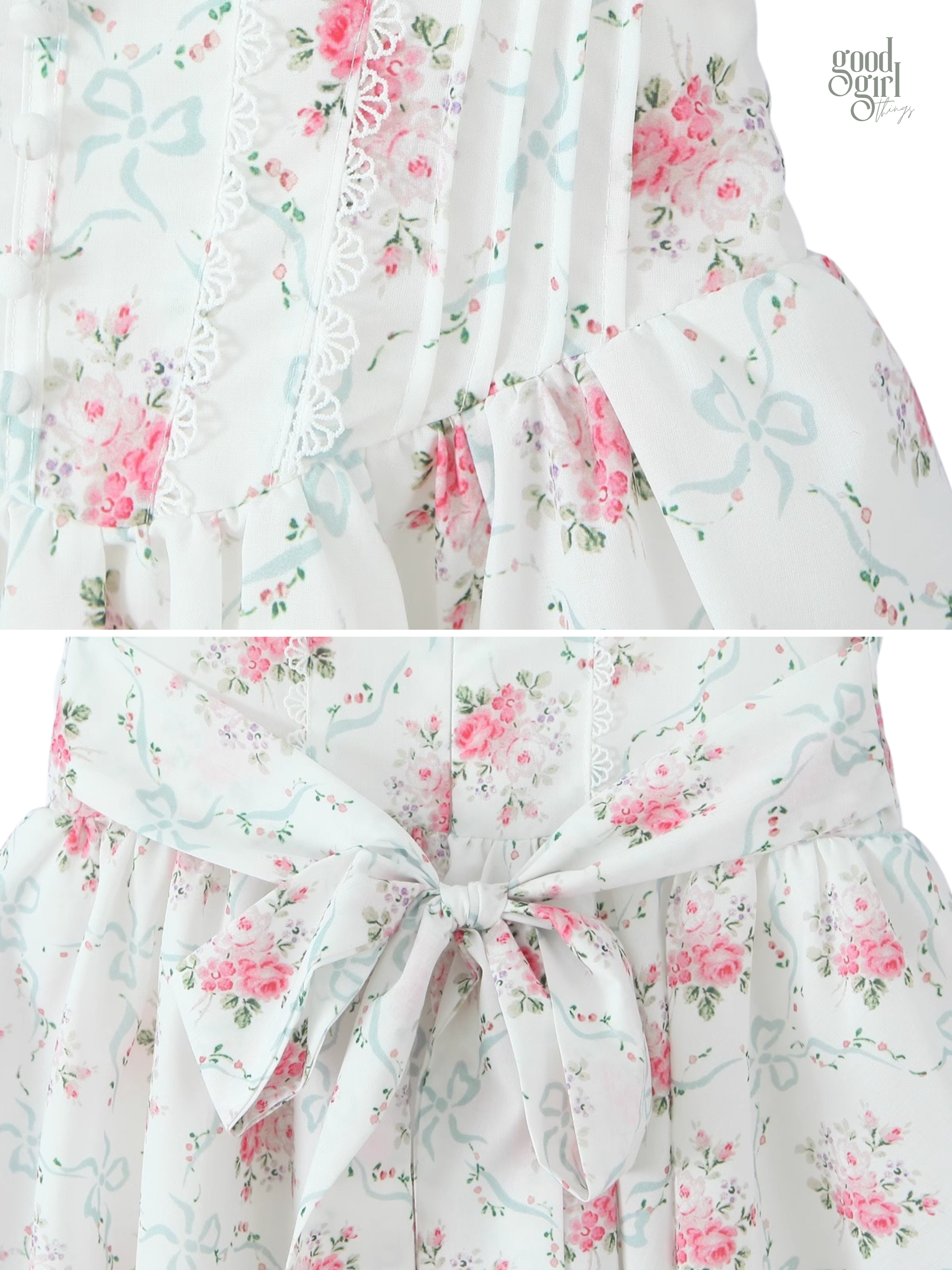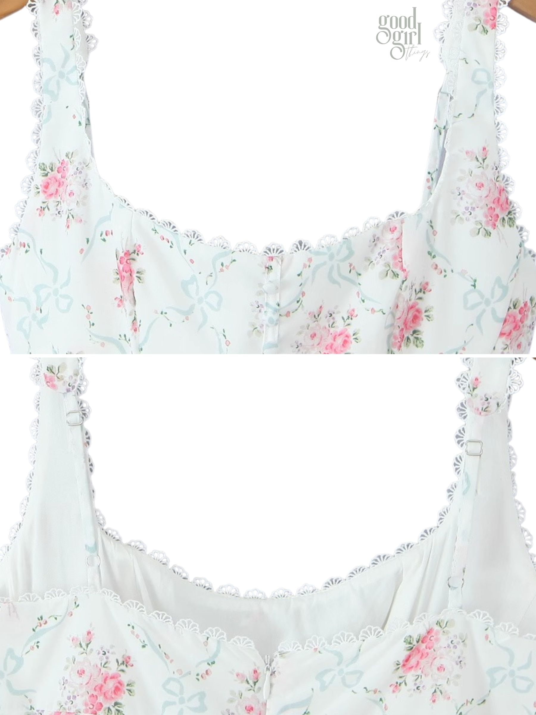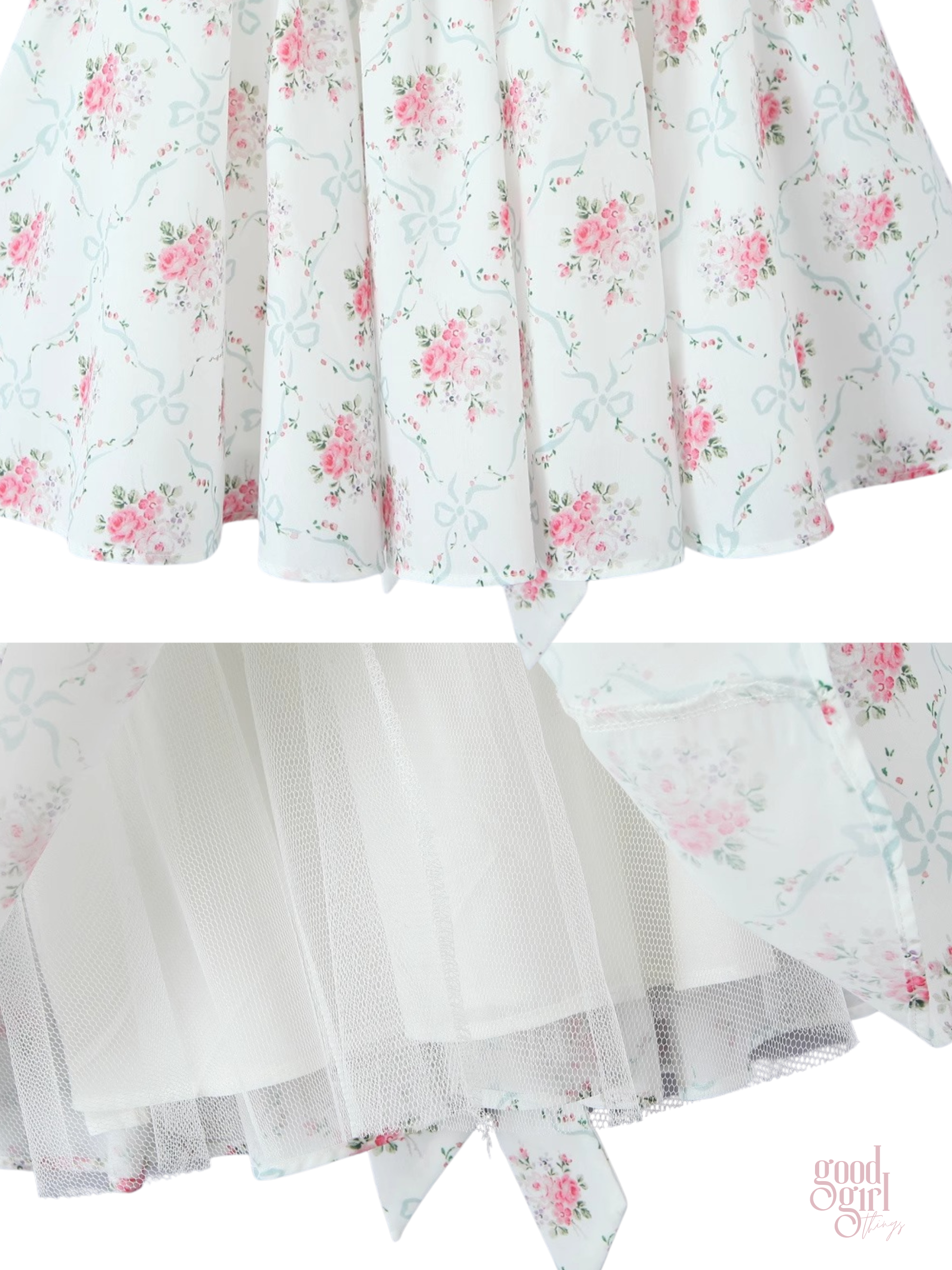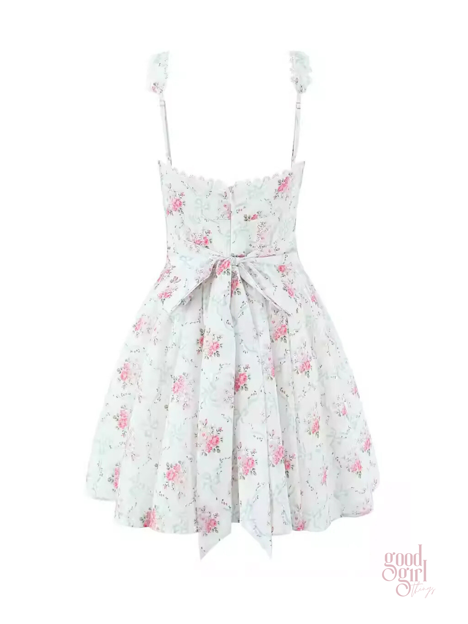 Whimsical charm meets vintage romance in this Reina Floral Mini Dress, adorned with delicate rose prints and soft blue ribbon motifs. The sweet scalloped neckline and dainty lace-trimmed straps bring a fairy-tale feel, while the full skirt and back bow create a flattering silhouette perfect for twirling through a garden or a sunny afternoon. Ideal for picnics, daytime dates, or simply feeling pretty, this piece is a dreamy ode to timeless femininity.