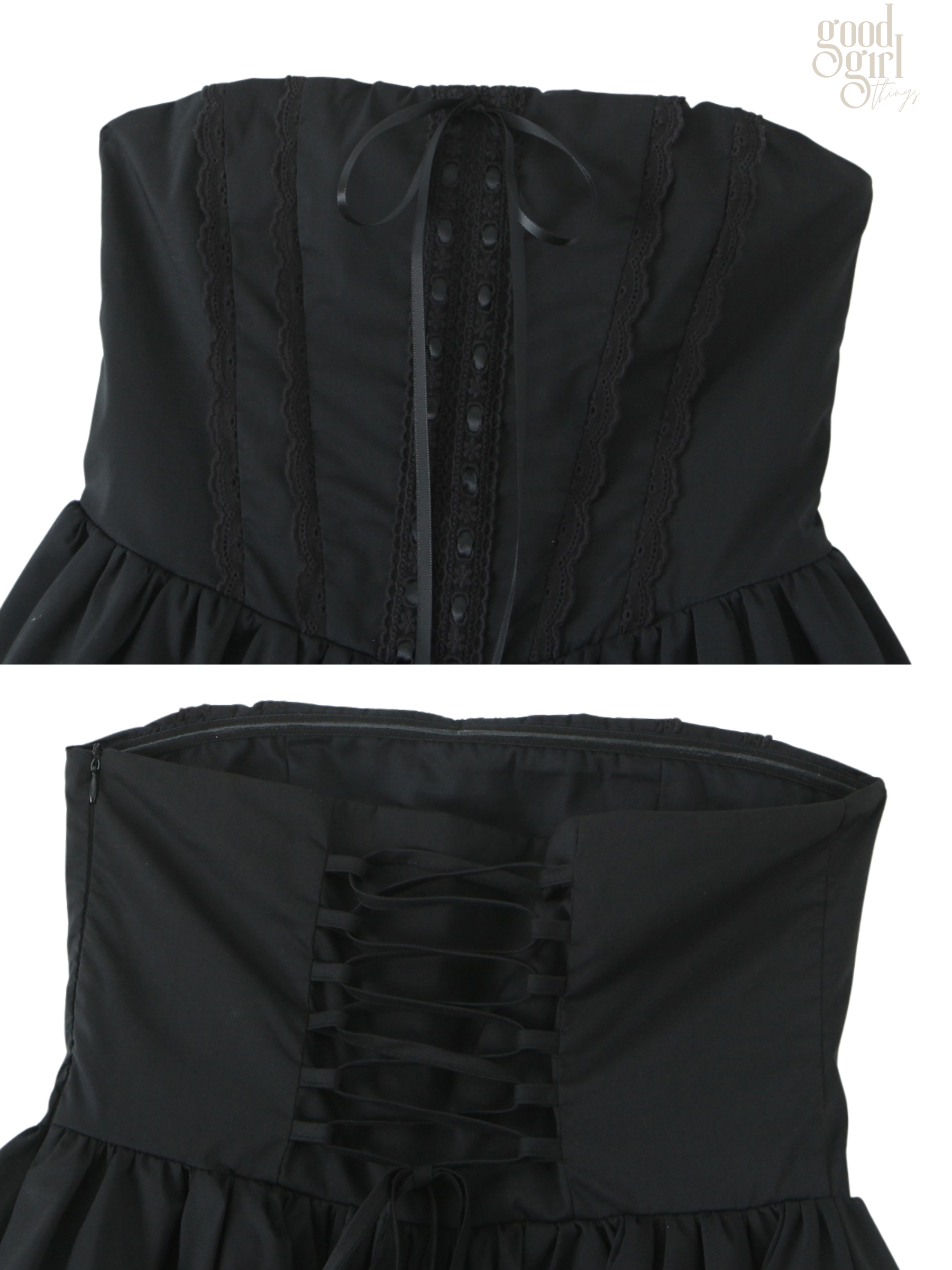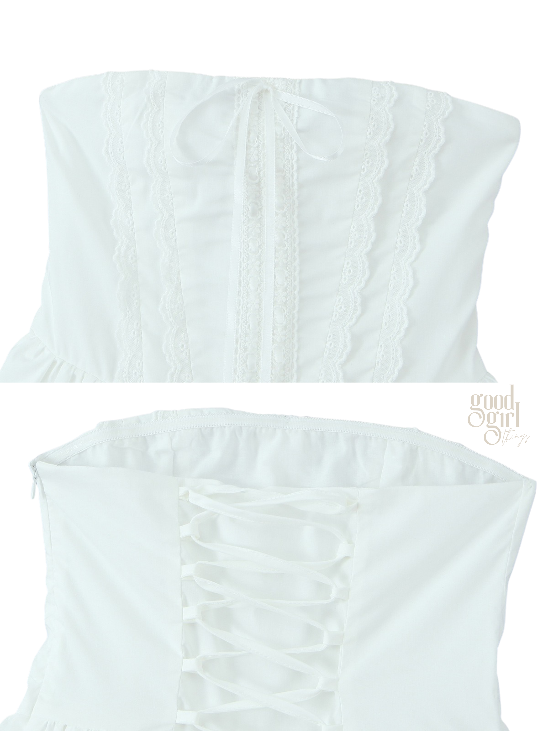 - Convenient back zipper closure for a seamless fit.