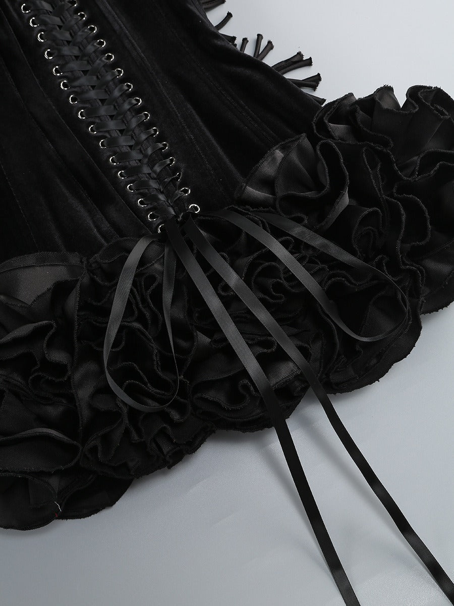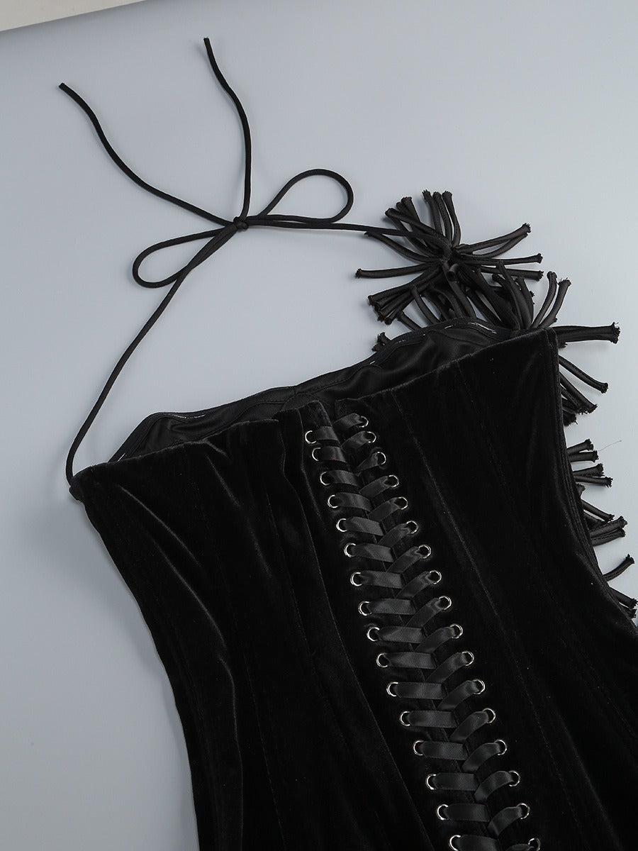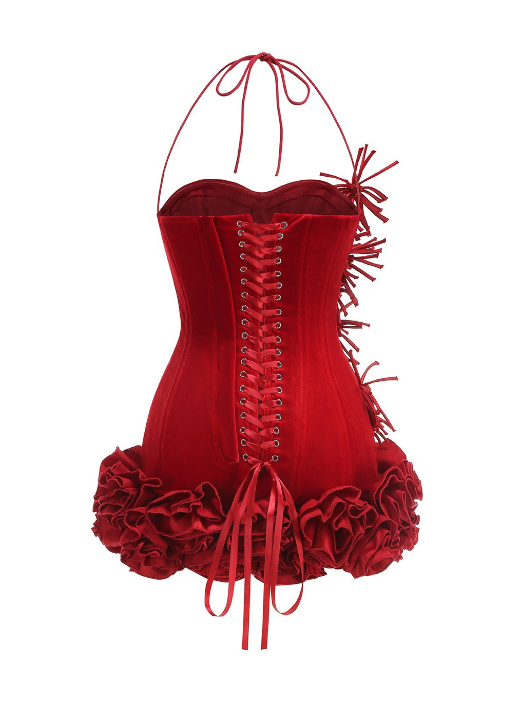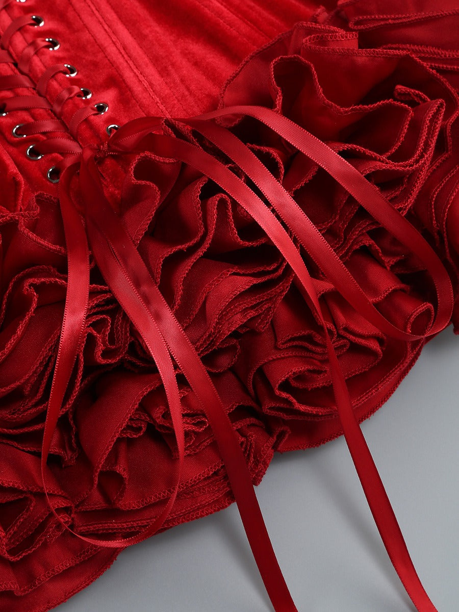 Embrace drama and allure with the Scarlett Velvet Corset Dress, a show-stopping piece that captures the essence of sensual femininity. Crafted from rich, luxurious velvet, this corset-style mini dress features structured boning that sculpts the body, creating a flawless hourglass silhouette. The halter neckline ties elegantly at the neck, while the lace-up front and side ribbon details add a touch of romantic vintage flair. Finished with a voluminous ruffled hemline that moves beautifully with every step, this dress is designed to turn heads at any special occasion or exclusive event.