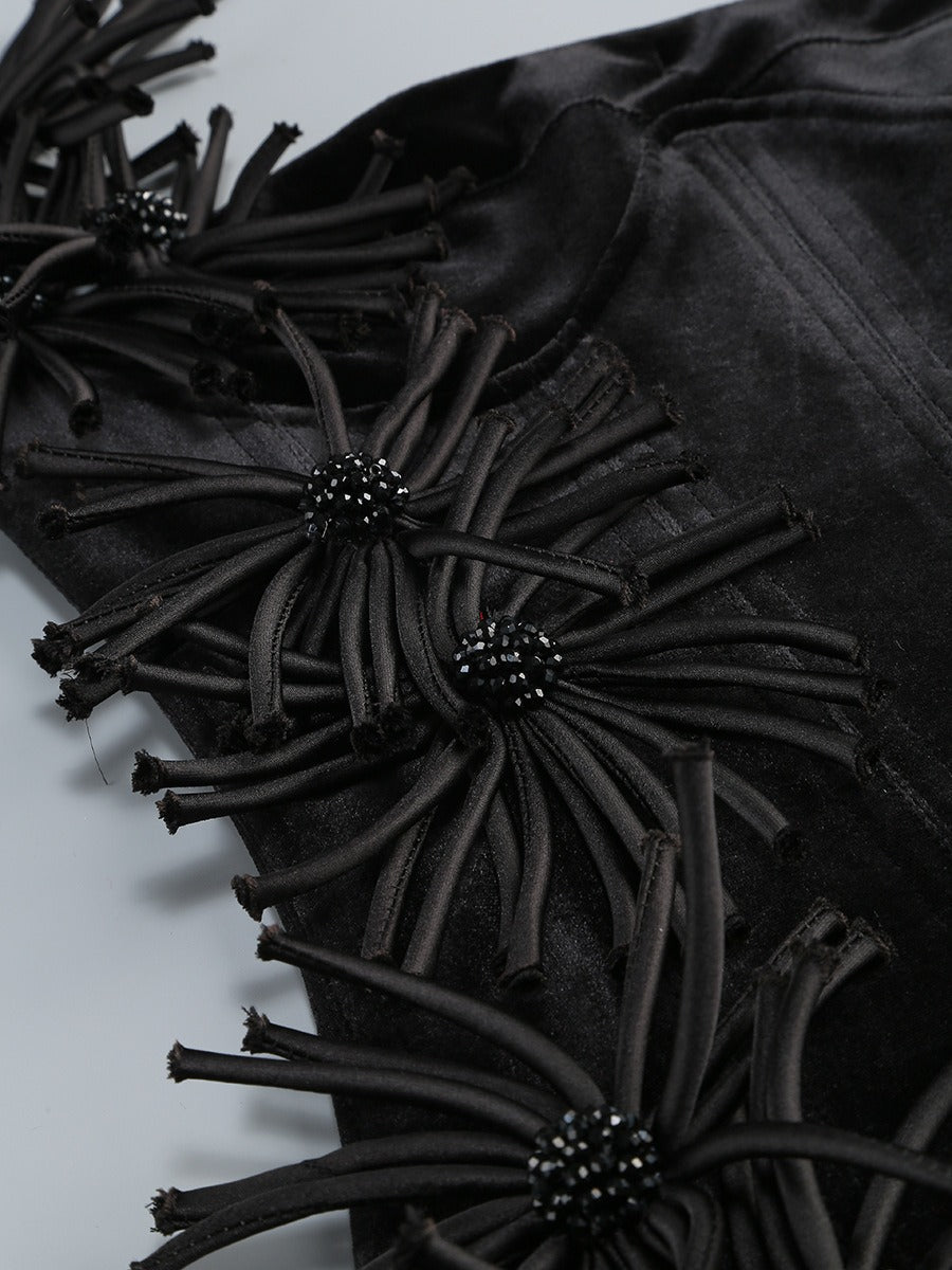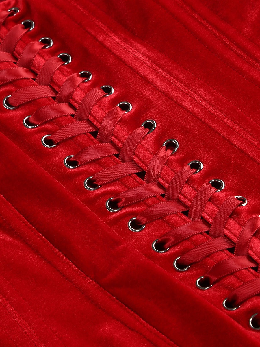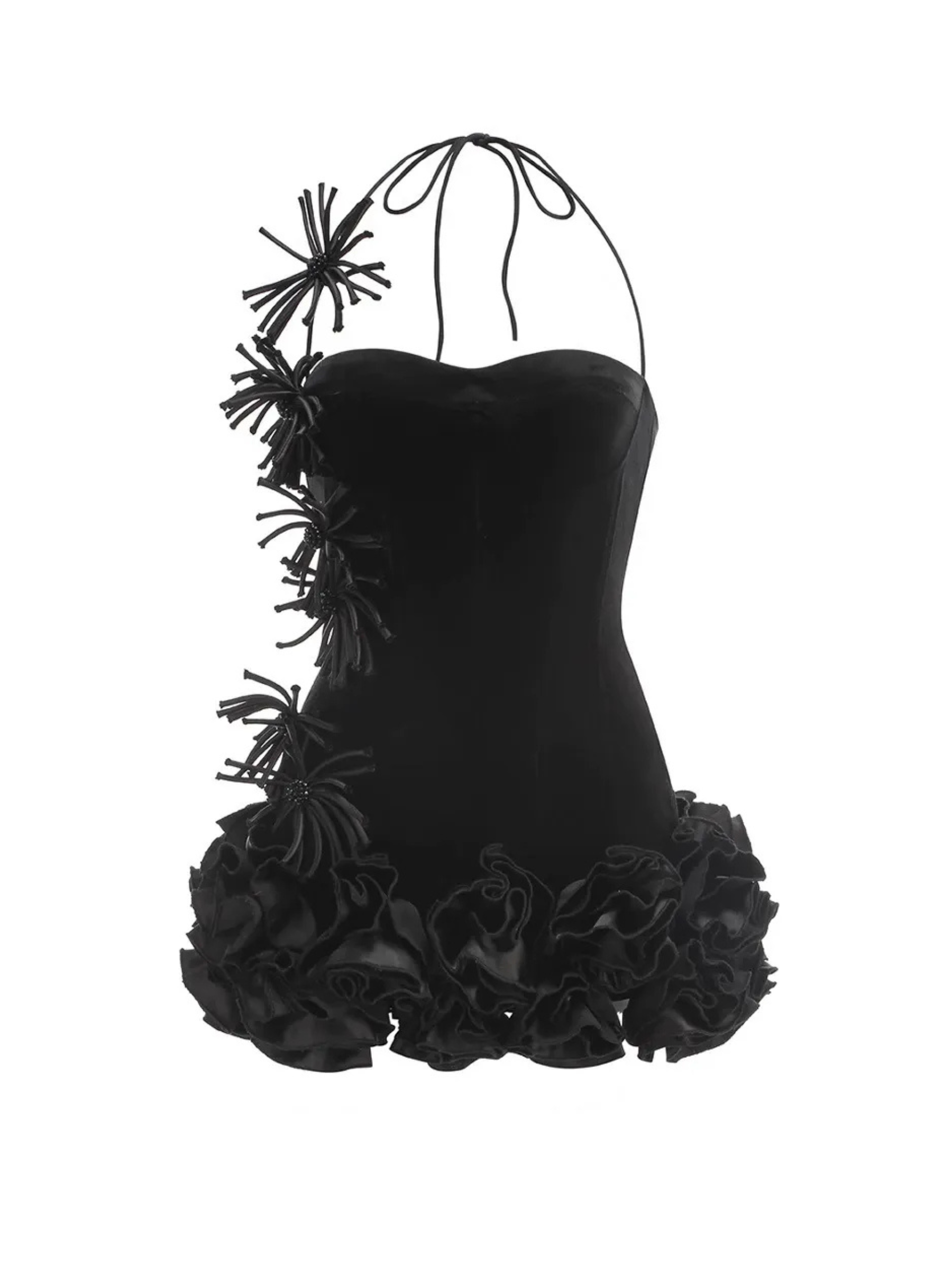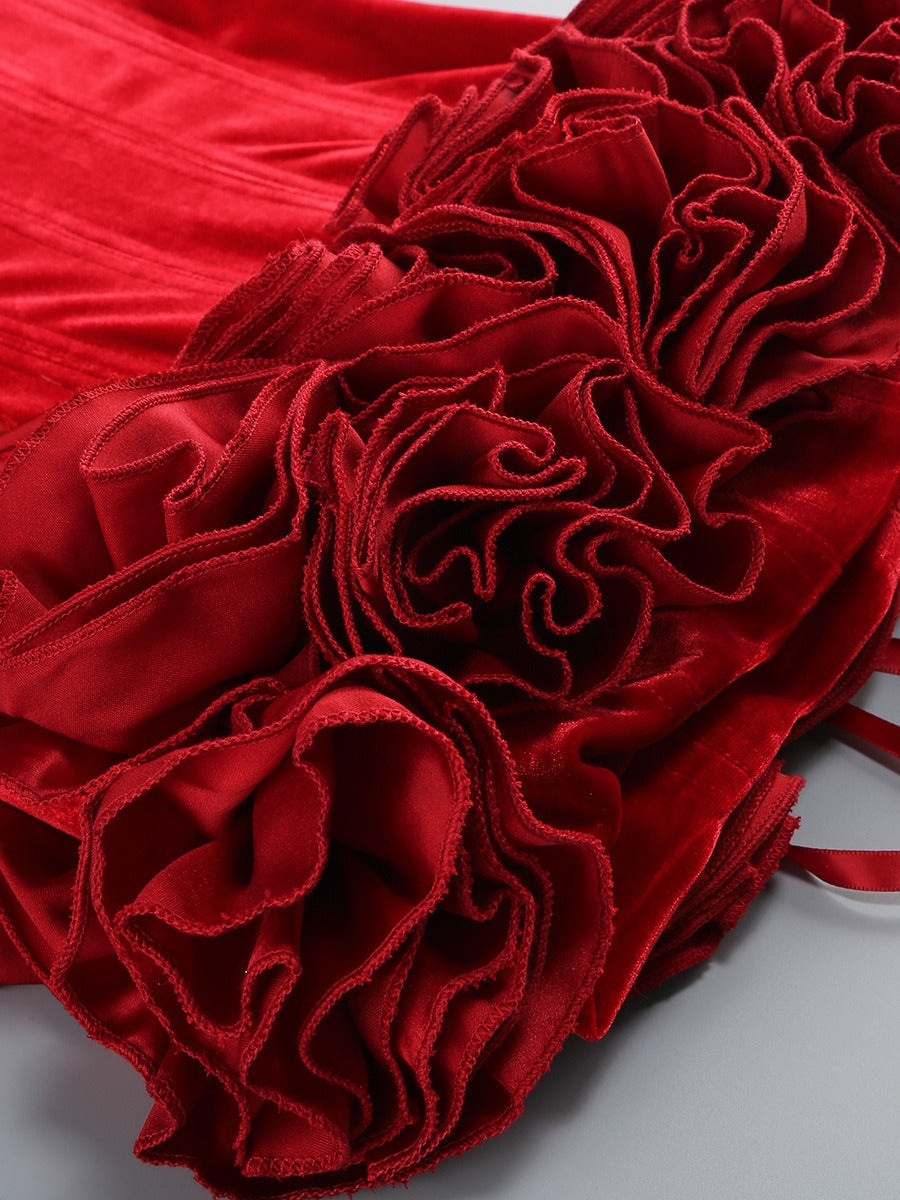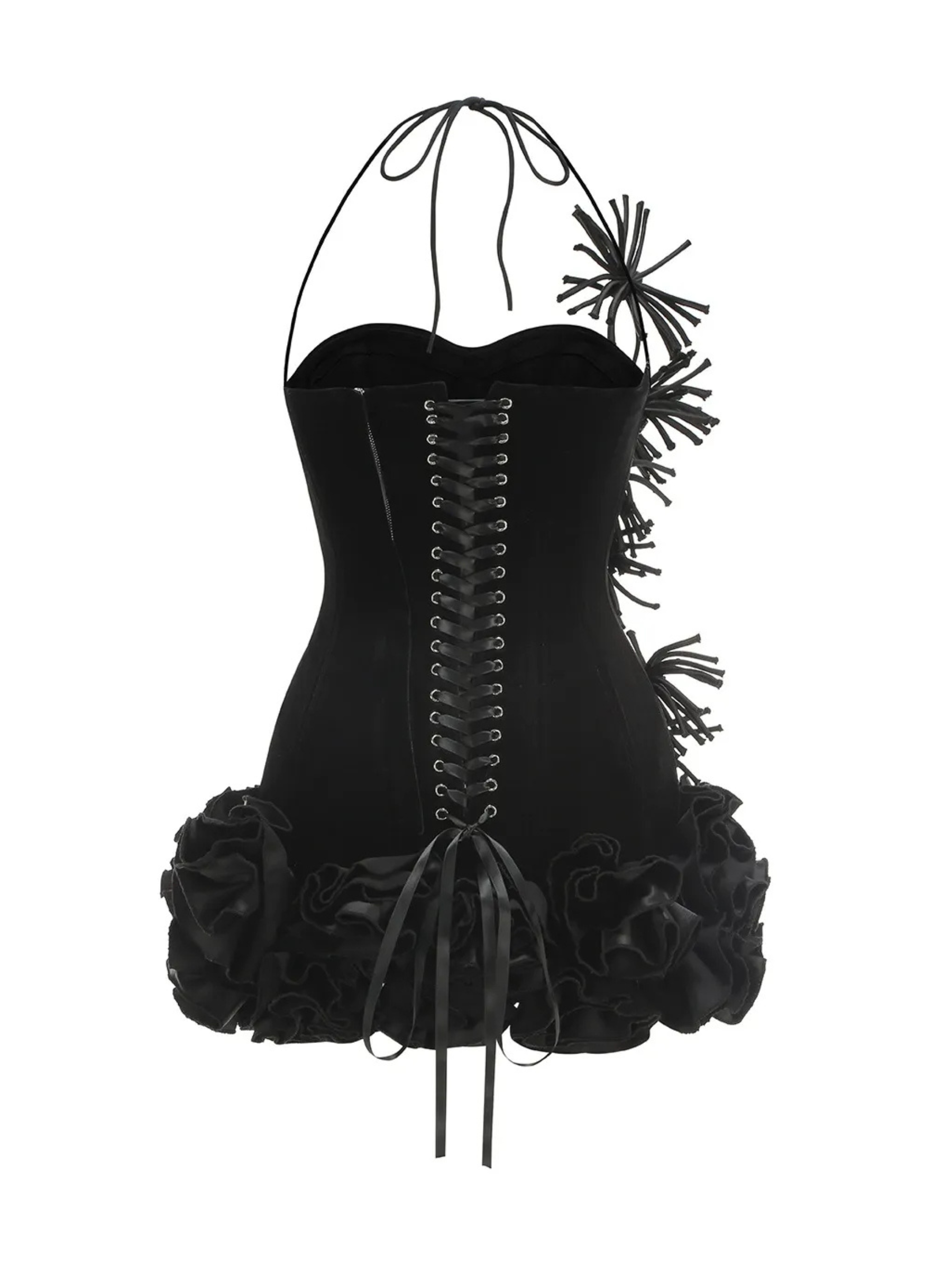 Embrace drama and allure with the Scarlett Velvet Corset Dress, a show-stopping piece that captures the essence of sensual femininity. Crafted from rich, luxurious velvet, this corset-style mini dress features structured boning that sculpts the body, creating a flawless hourglass silhouette. The halter neckline ties elegantly at the neck, while the lace-up front and side ribbon details add a touch of romantic vintage flair. Finished with a voluminous ruffled hemline that moves beautifully with every step, this dress is designed to turn heads at any special occasion or exclusive event.