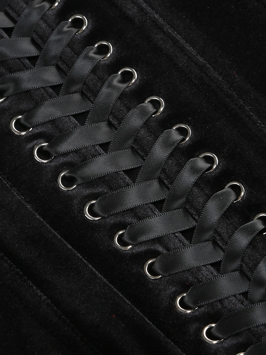 - Design: Corset silhouette with lace-up front and side ribbon ties