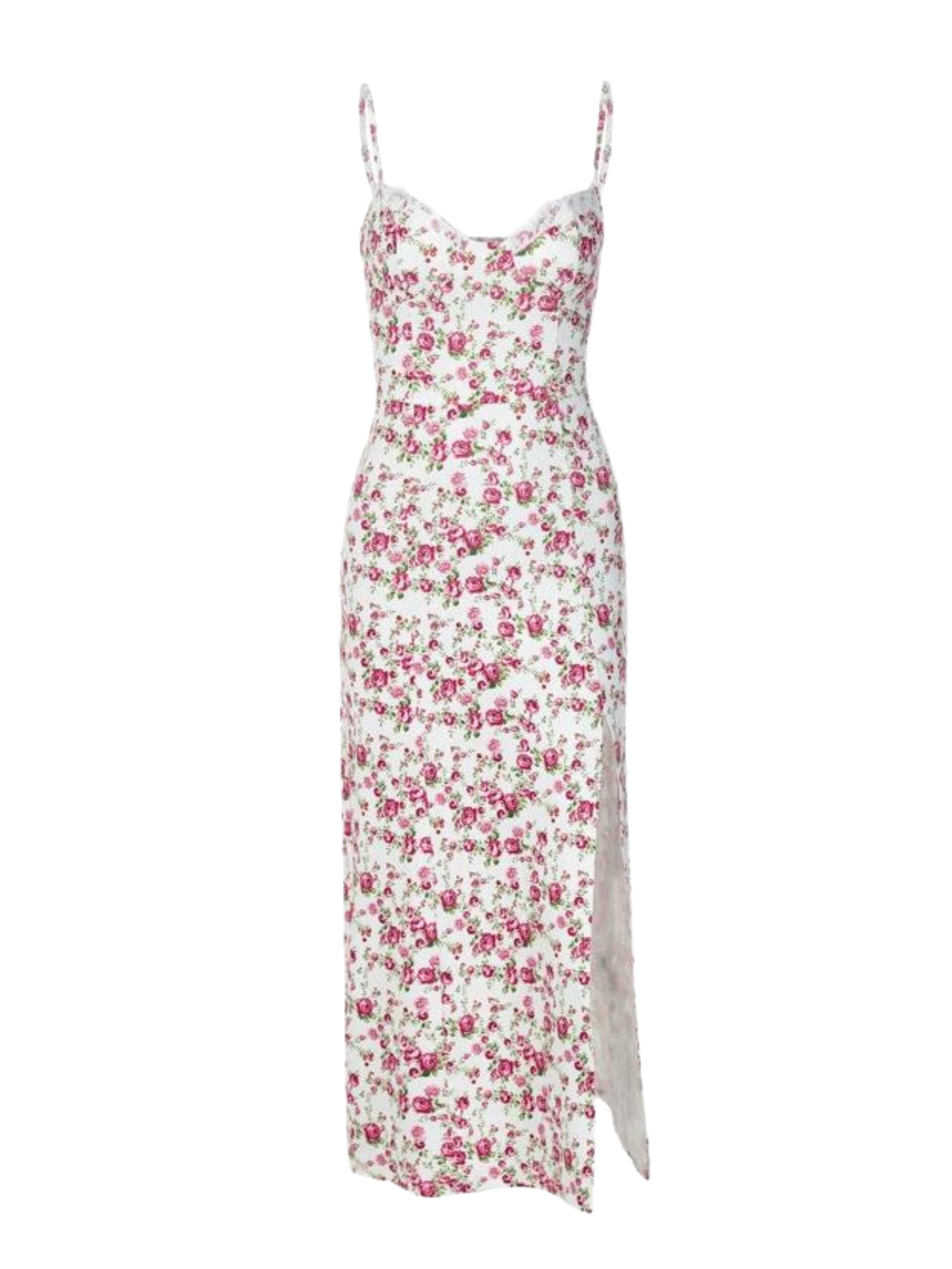 Ready for romantic French-style adventure? Introducing the Sereen Floral Midi Dress: crafted with a high waist, lace detailing, and a heart-shaped neck! Plus side slit and adjustable spaghetti straps for those luxurious summer days. The 'Good Girl Things Summer's in Bloom' collection is blooming with possibilities - let's get started!