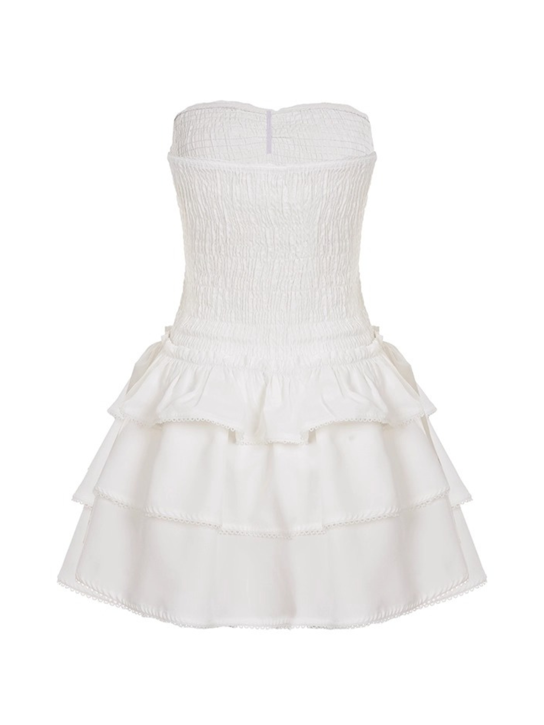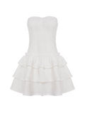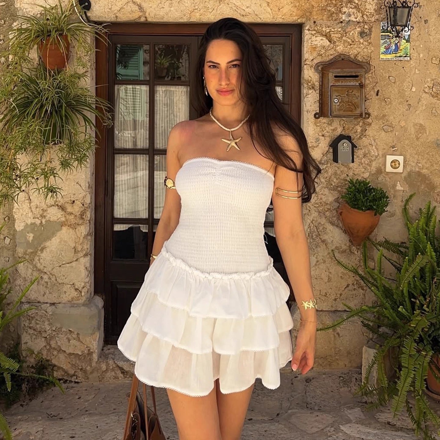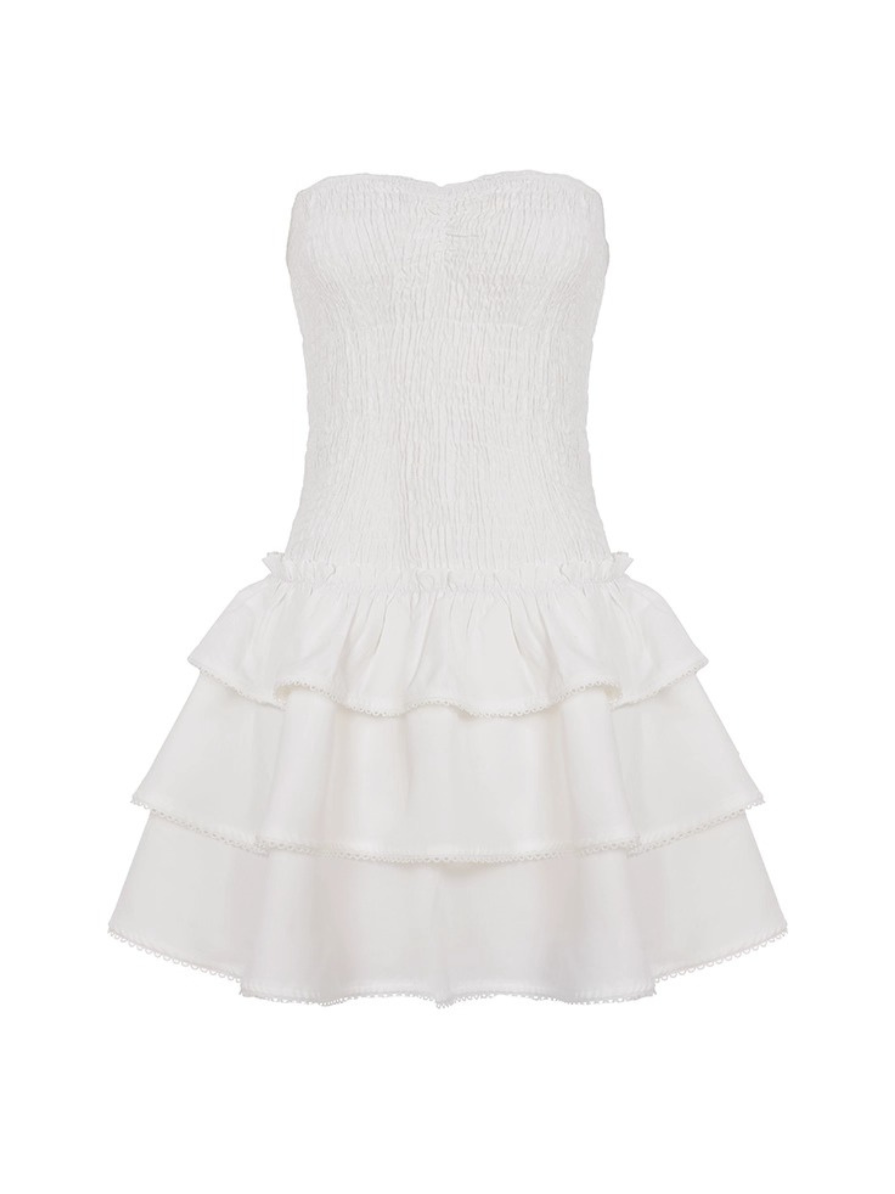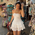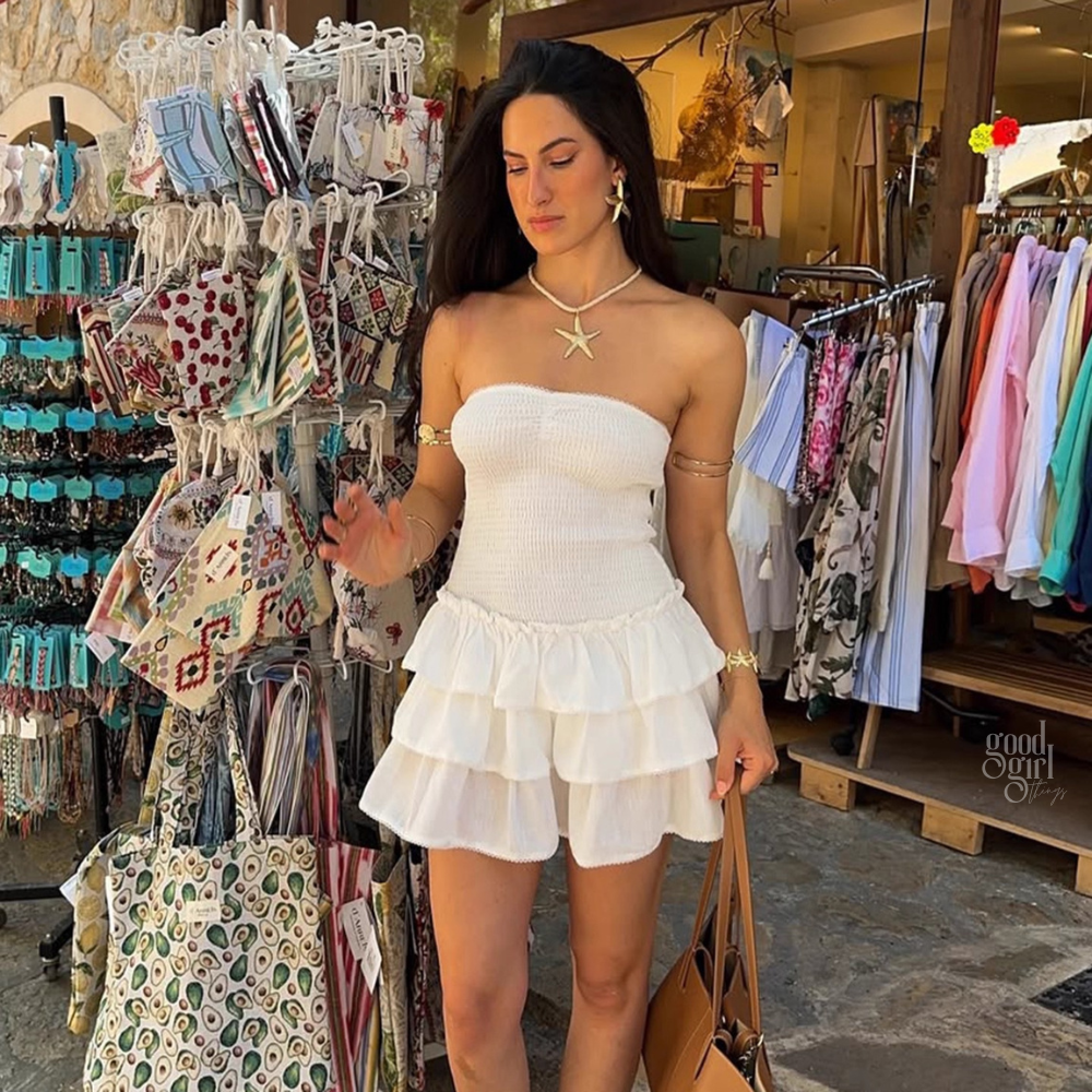 Feel like a summer muse in this effortlessly romantic strapless mini dress. Featuring a stretchy smocked bodice that hugs your curves with comfort and ease, and a flouncy tiered skirt that adds playful movement to every step. The soft white hue and delicate ruffle details make it a dreamy piece for vacations, beach strolls, or sunset dinners.