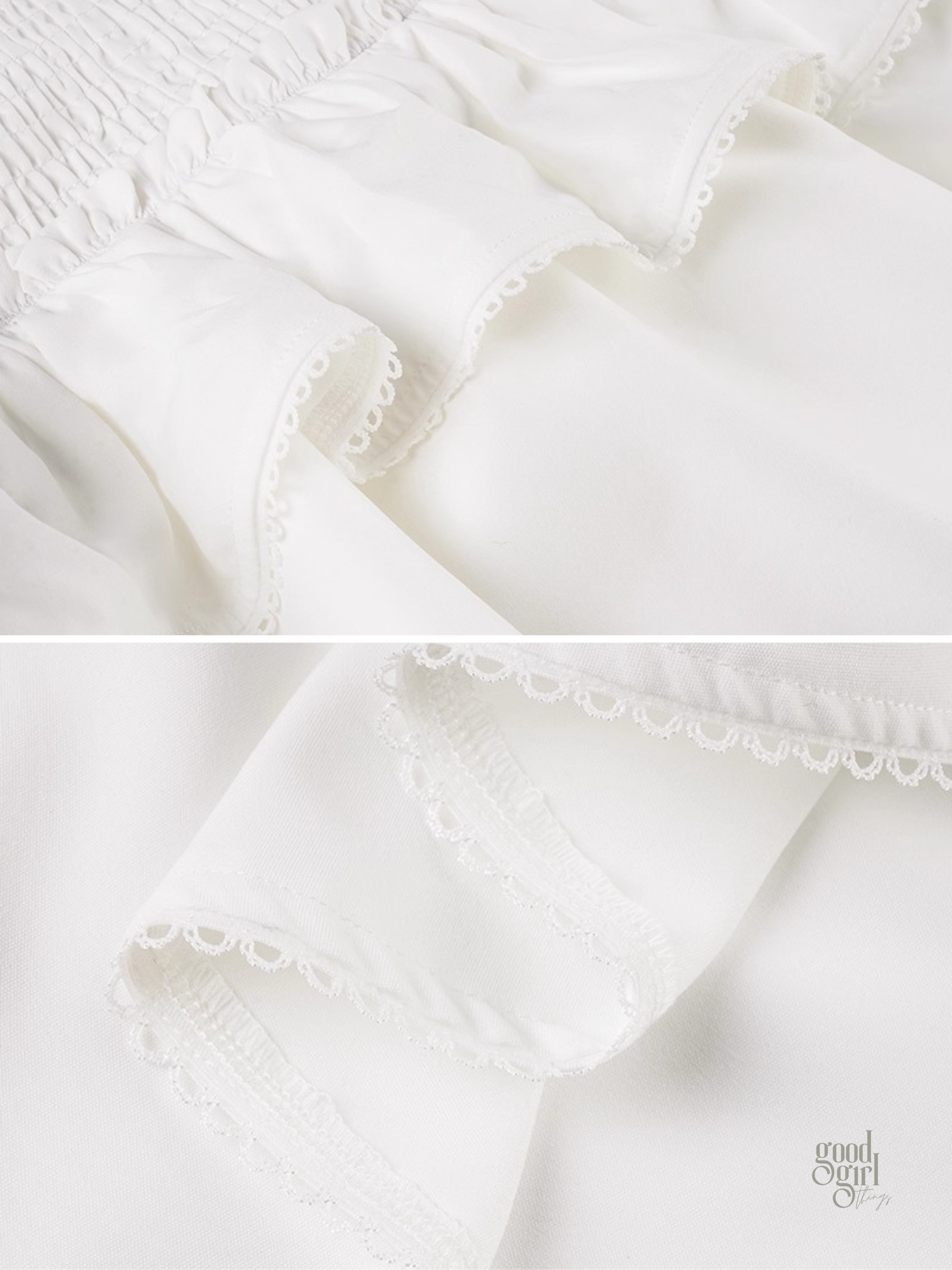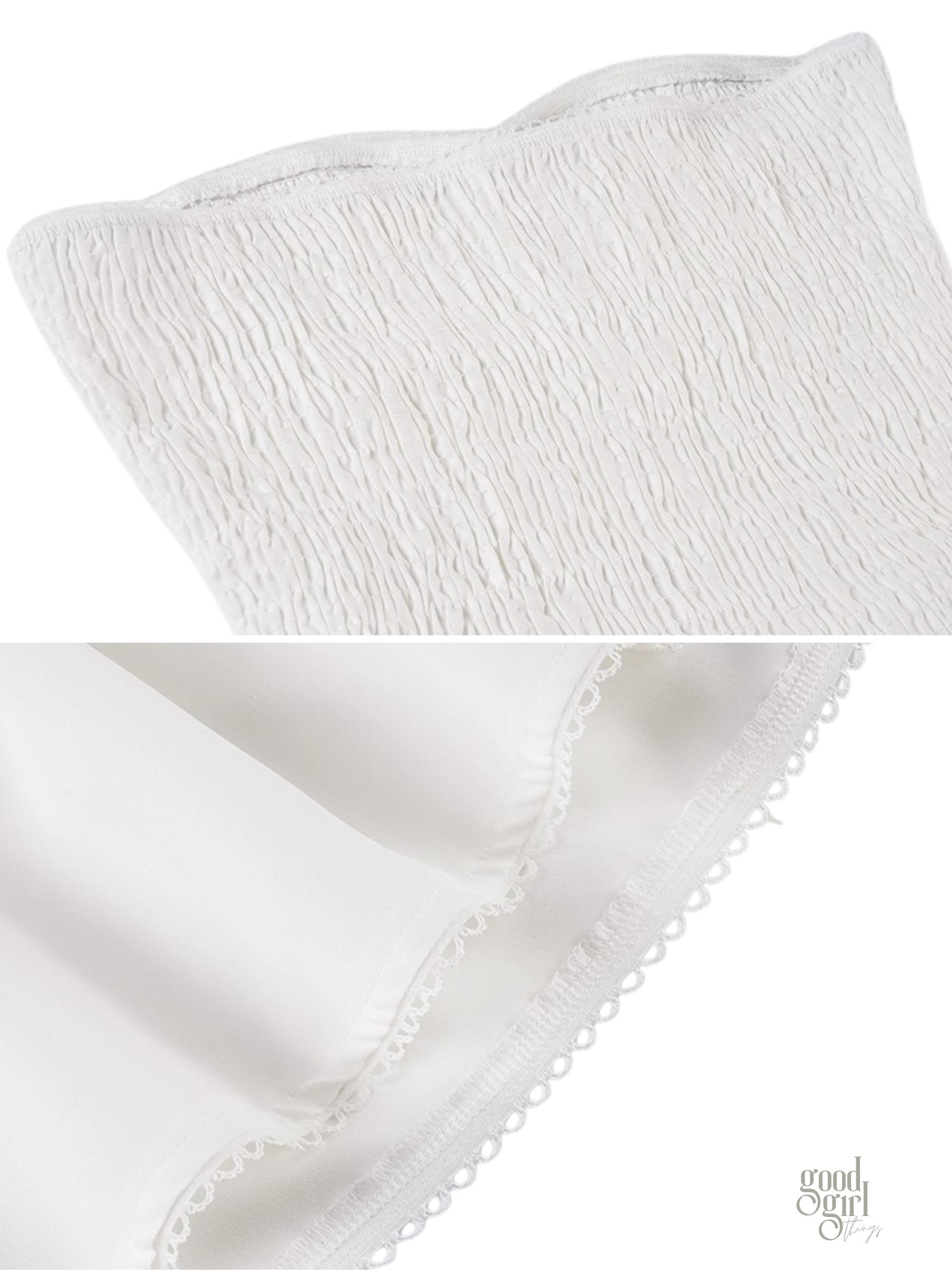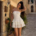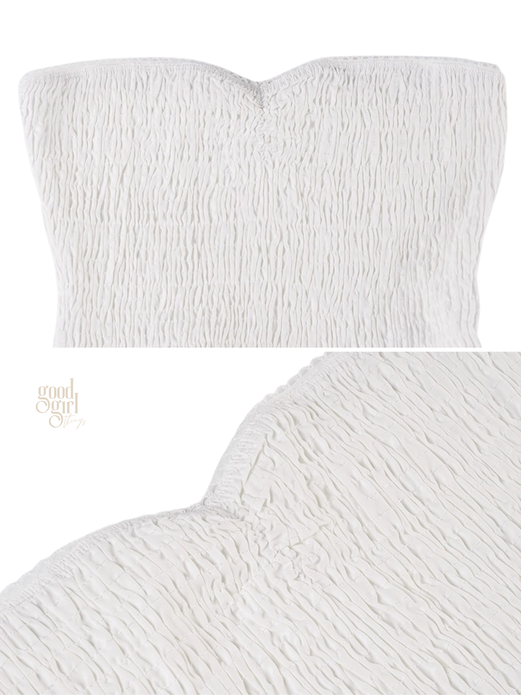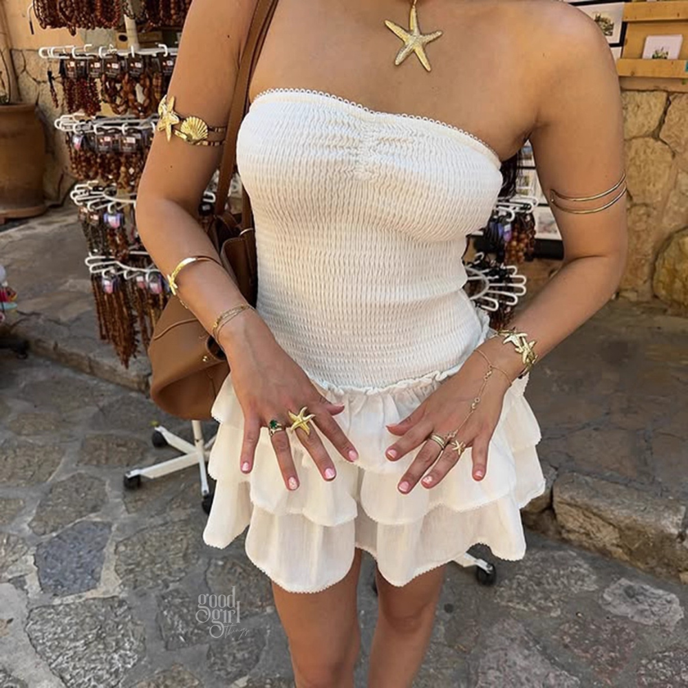 Feel like a summer muse in this effortlessly romantic strapless mini dress. Featuring a stretchy smocked bodice that hugs your curves with comfort and ease, and a flouncy tiered skirt that adds playful movement to every step. The soft white hue and delicate ruffle details make it a dreamy piece for vacations, beach strolls, or sunset dinners.